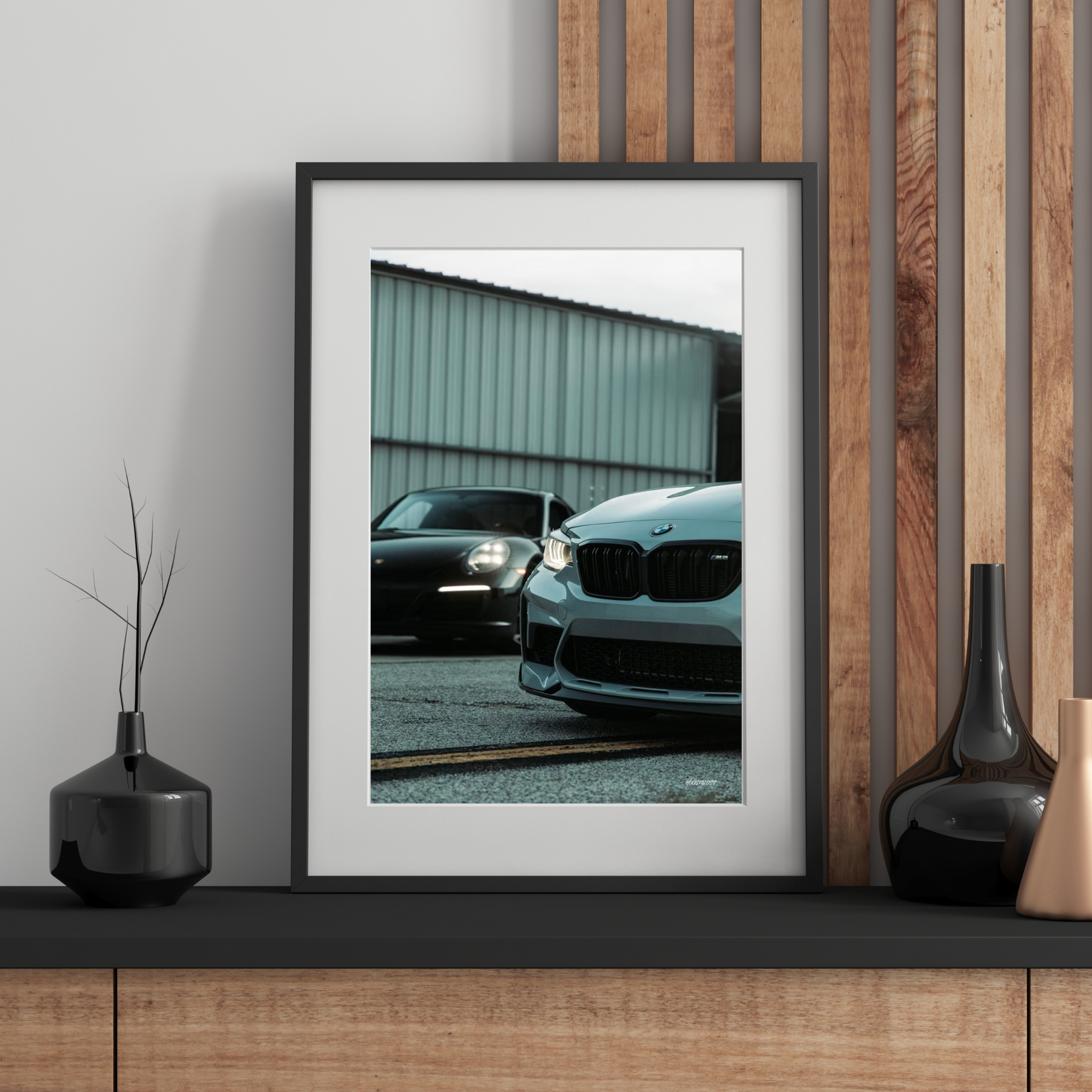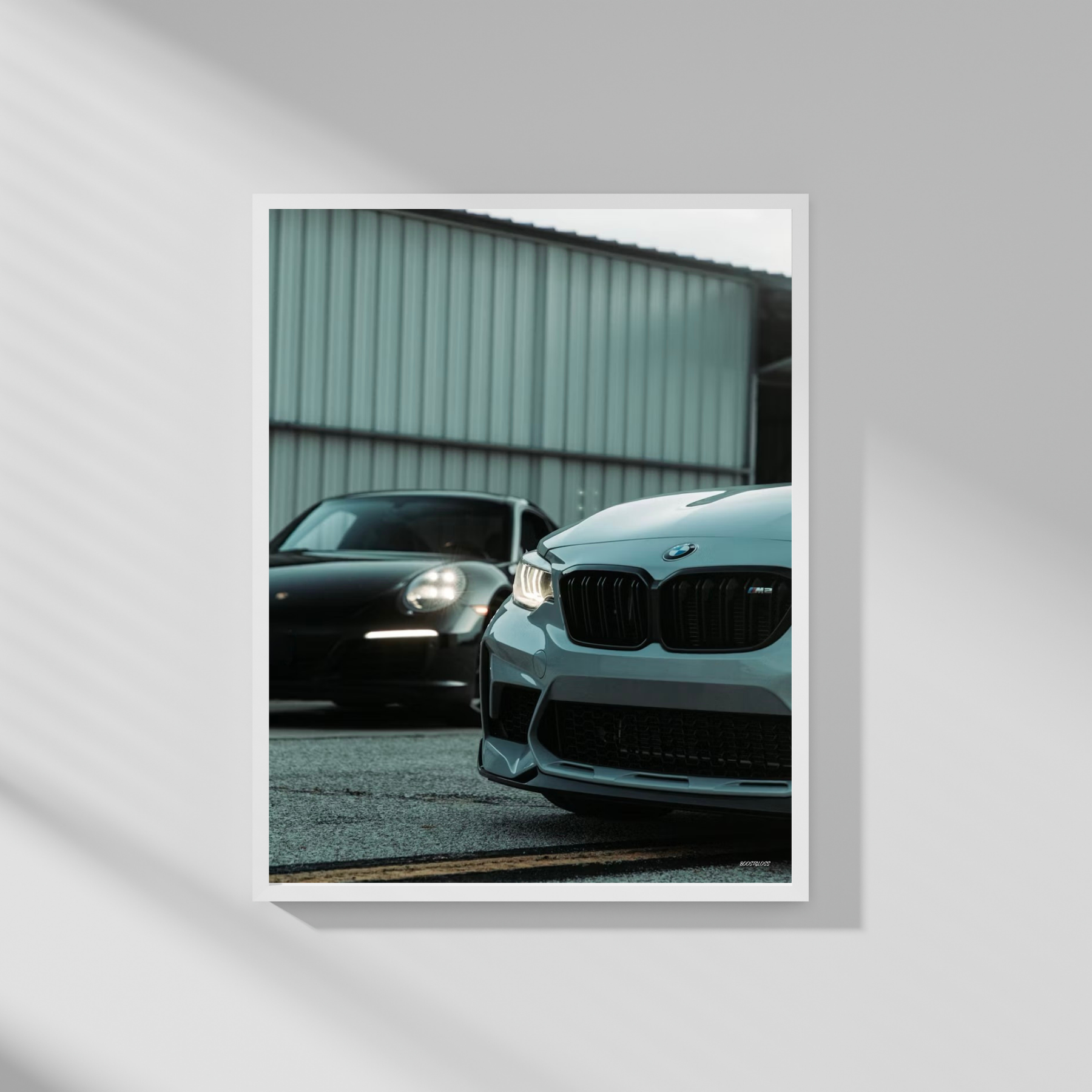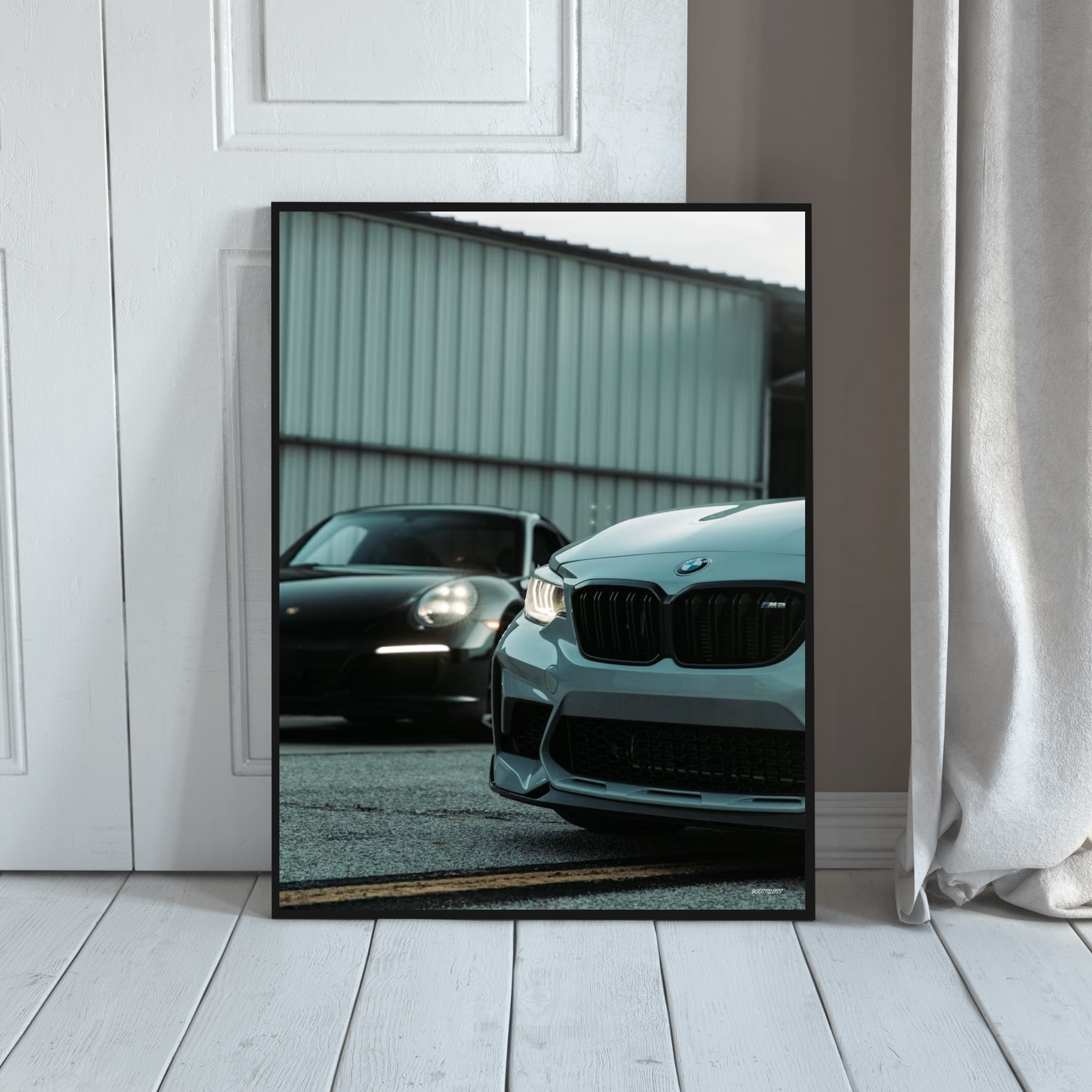 Motivet visar en grå BMW M2 i fokus, där den skarpa fronten dominerar bilden. I bakgrunden skymtar en svart Porsche, vilket skapar en kontrast mellan två ikoniska sportbilar – en kombination som ger bilden djup, dynamik och en känsla av ren prestanda. Postern är tryckt i Sverige på högkvalitativt Glossy premiumpapper, vilket ger en elegant finish och lång hållbarhet.