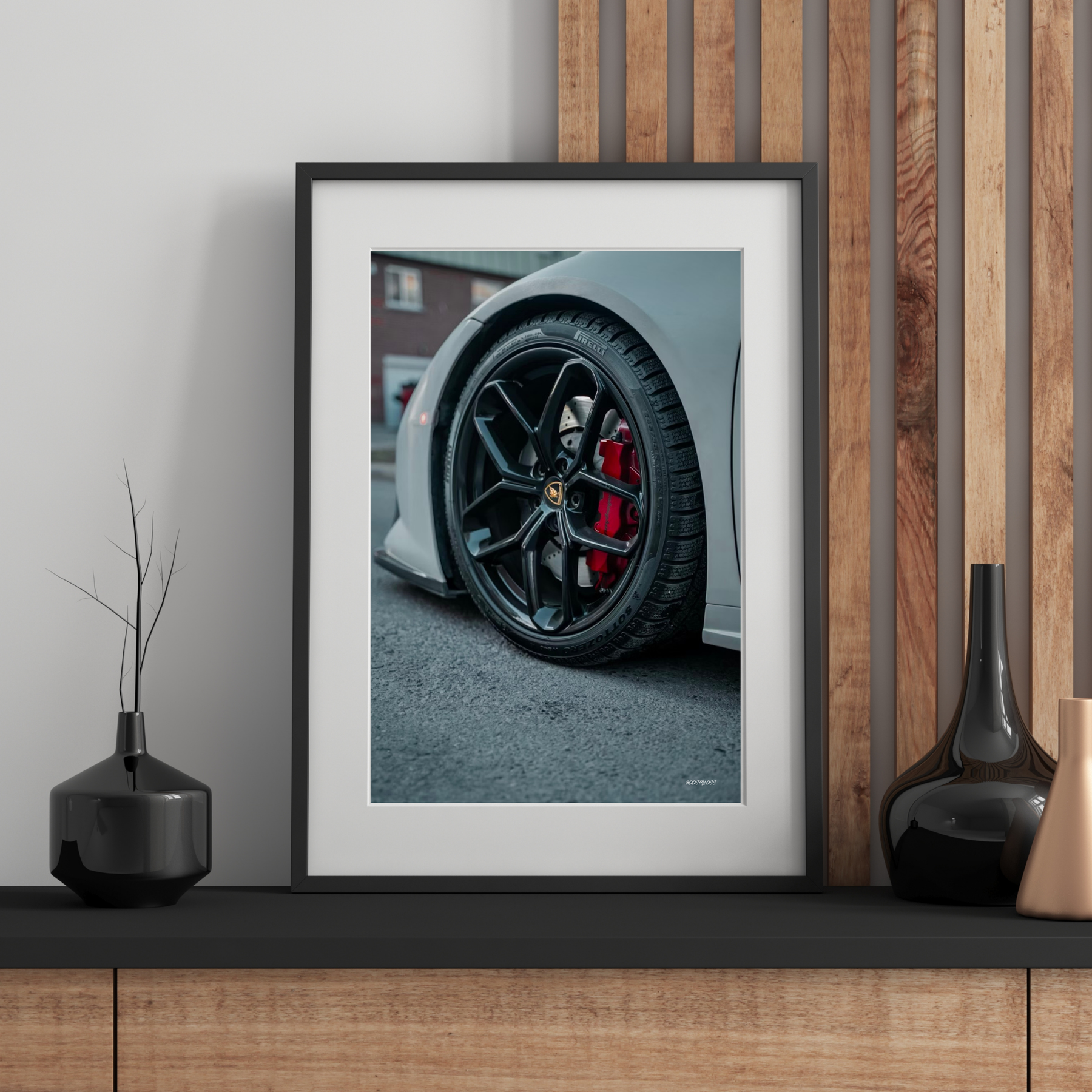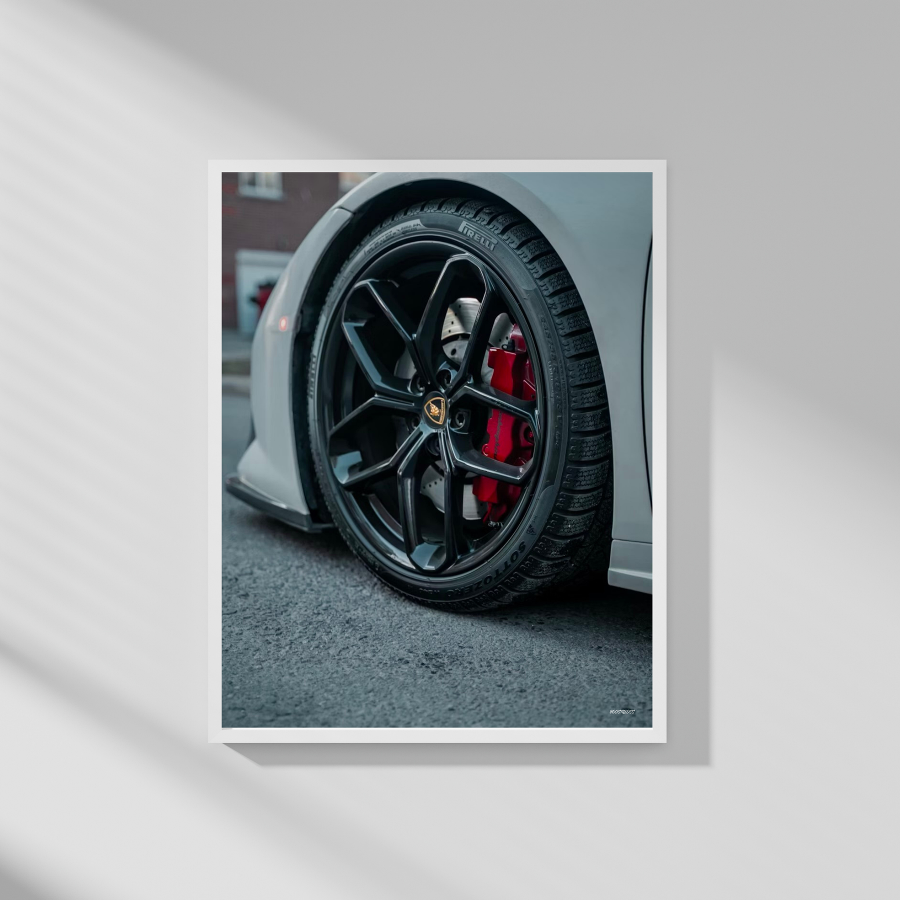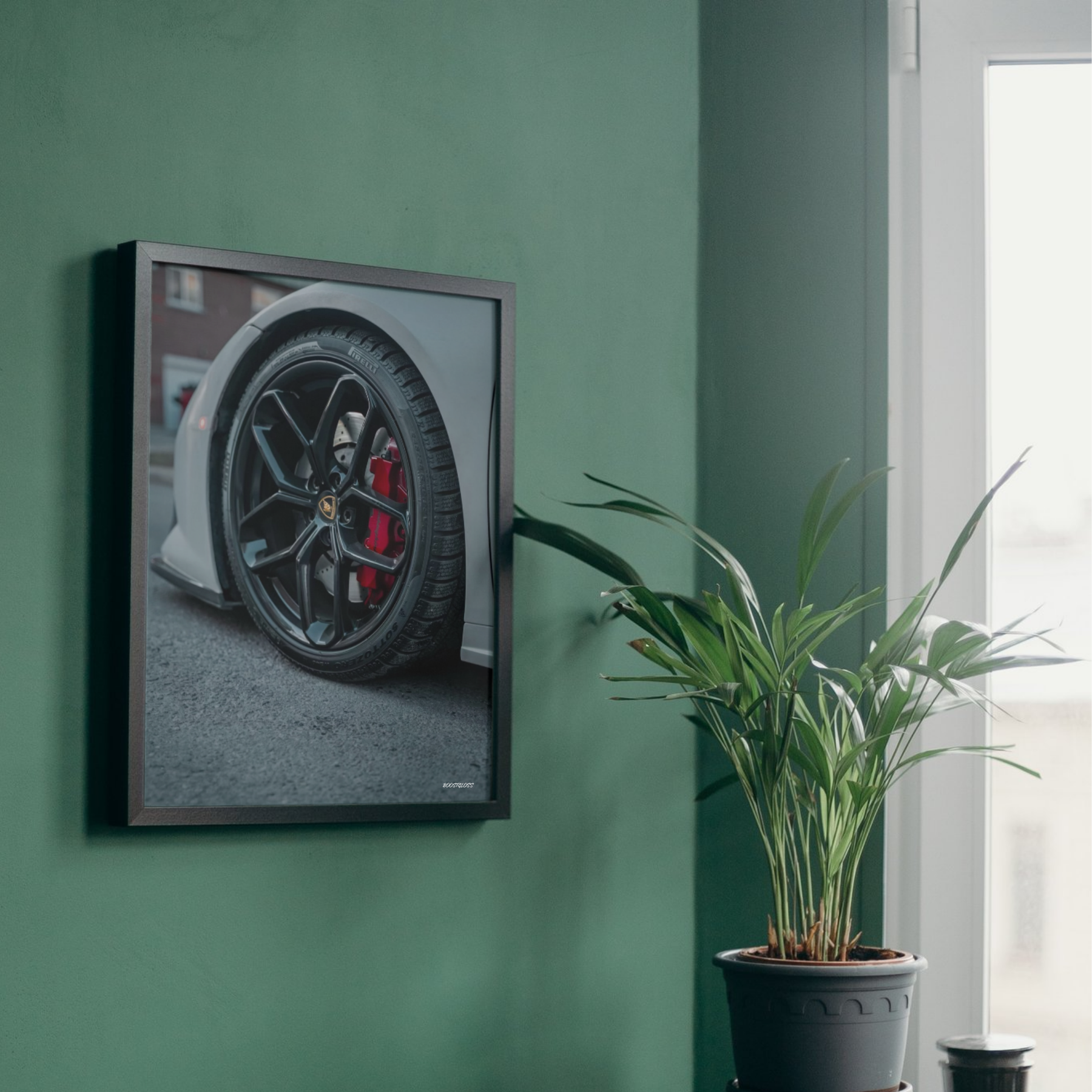 Motivet fångar en grå Lamborghini i detalj, där den sofistikerade fälgen och det röda bromsoket skapar en tydlig kontrast som framhäver bilens unika design och karaktär. Perfekt för dig som vill omge dig med stil, passion och känslan av exklusiv prestanda.Postern är tryckt i Sverige på högkvalitativt Glossy premiumpapper, vilket ger en elegant finish och lång hållbarhet.