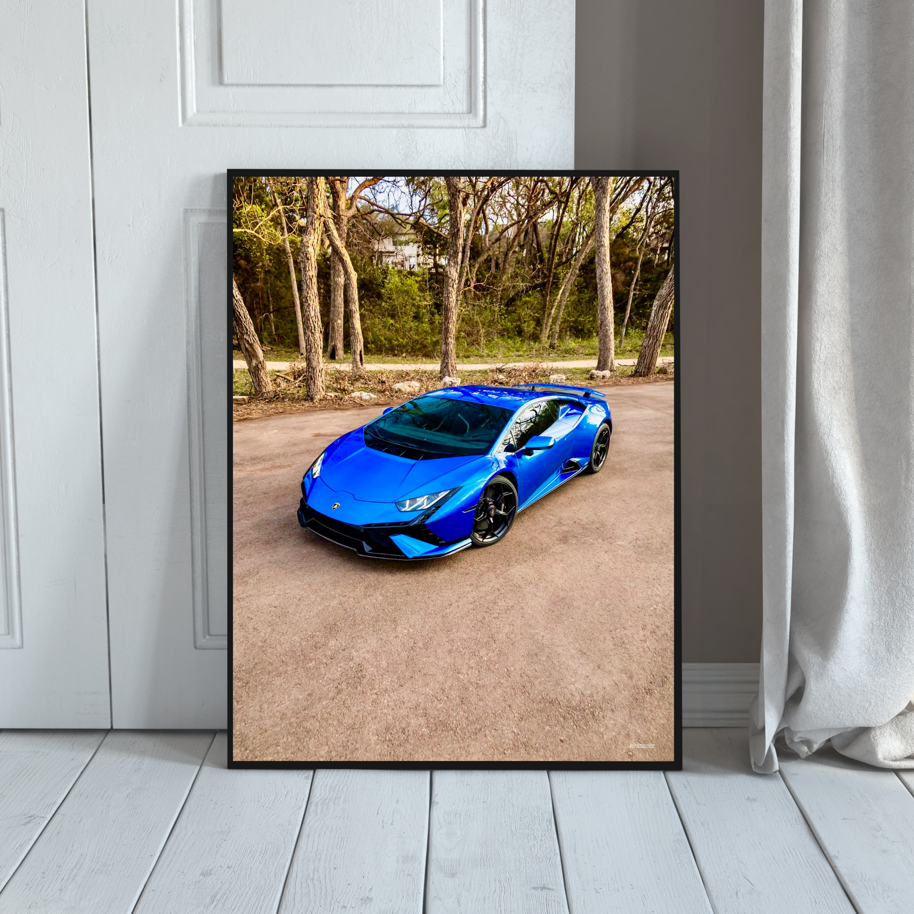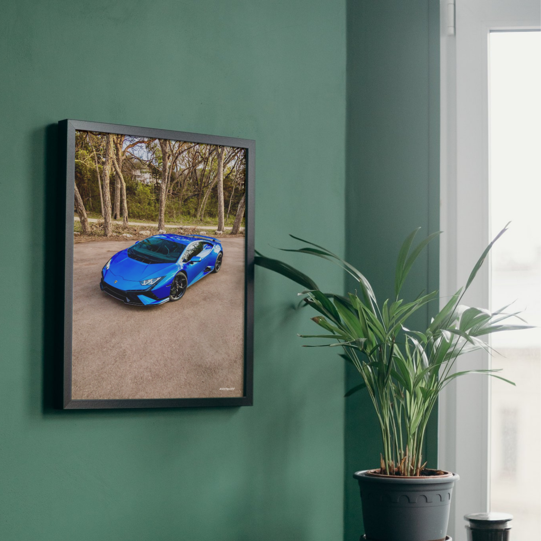 Ge din vägg ett uttryck av ren prestanda – beställ din poster idag och låt den blå Lamborghini påminna dig om att stillhet är ännu vackrare när den följer efter fart.