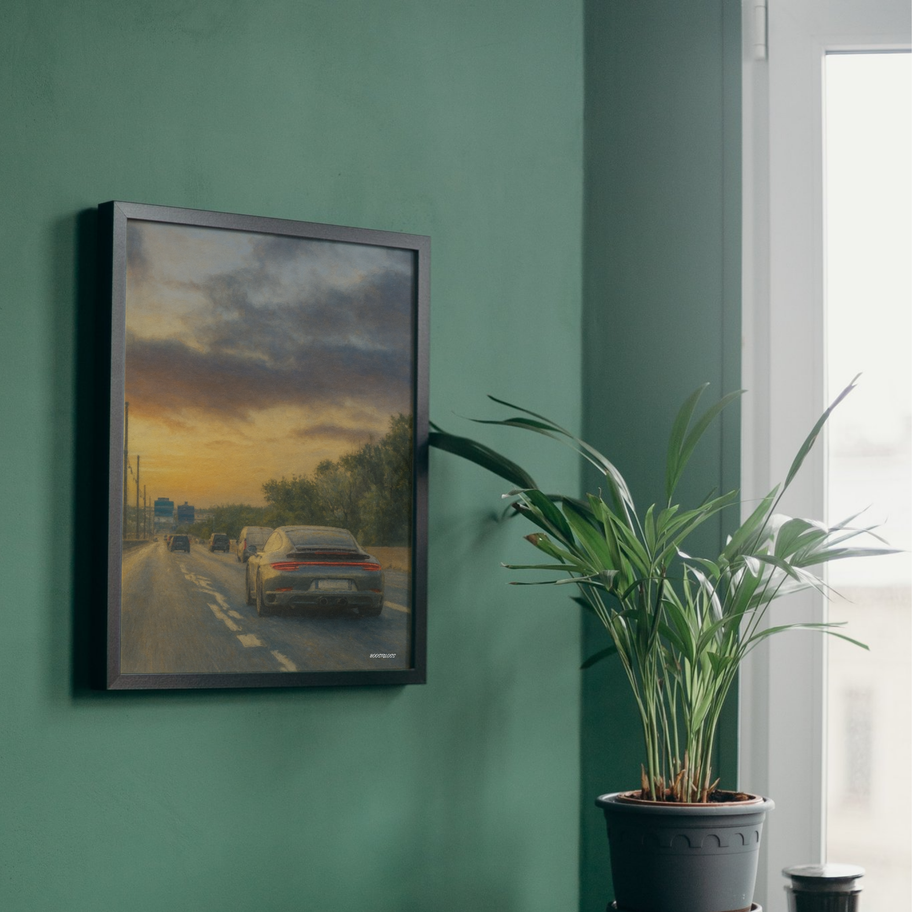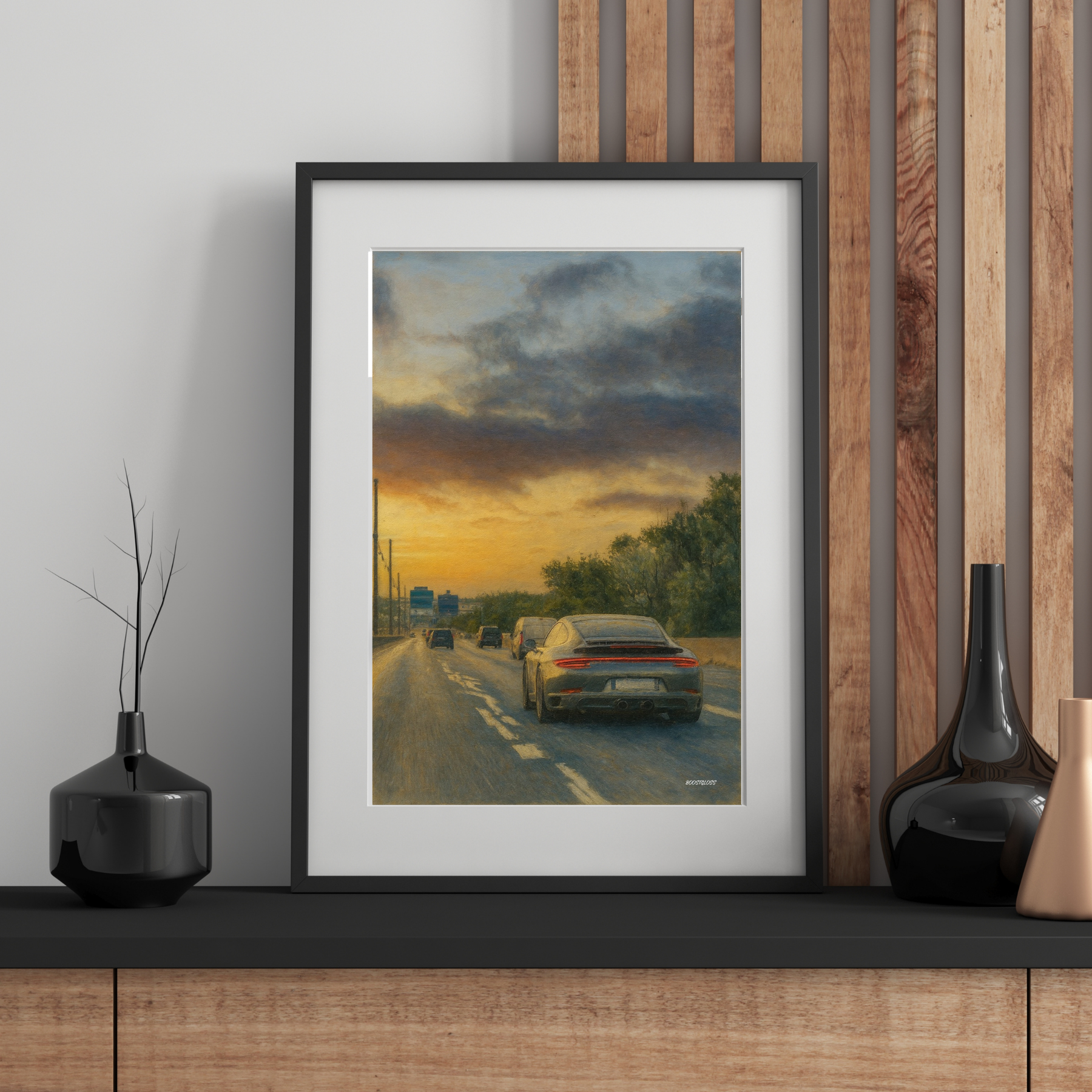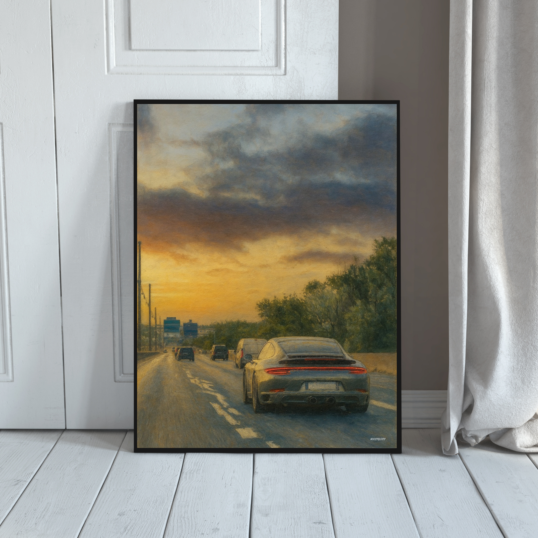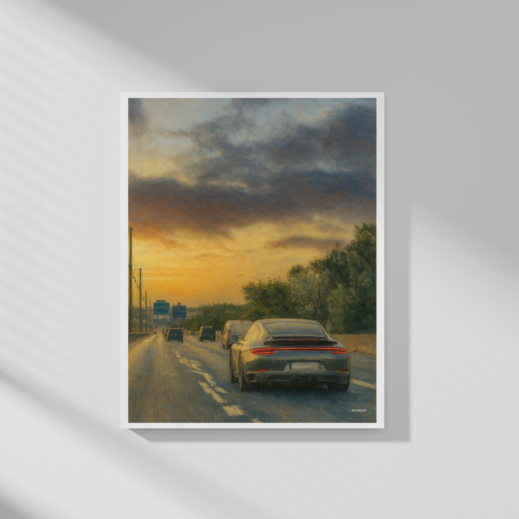 Motivet visar en Porsche fångad bakifrån på en öppen väg i solnedgångens varma ljus. Tryckt i Sverige på matt premiumpapper som framhäver motivets färgtoner och ger en mjuk, elegant yta.