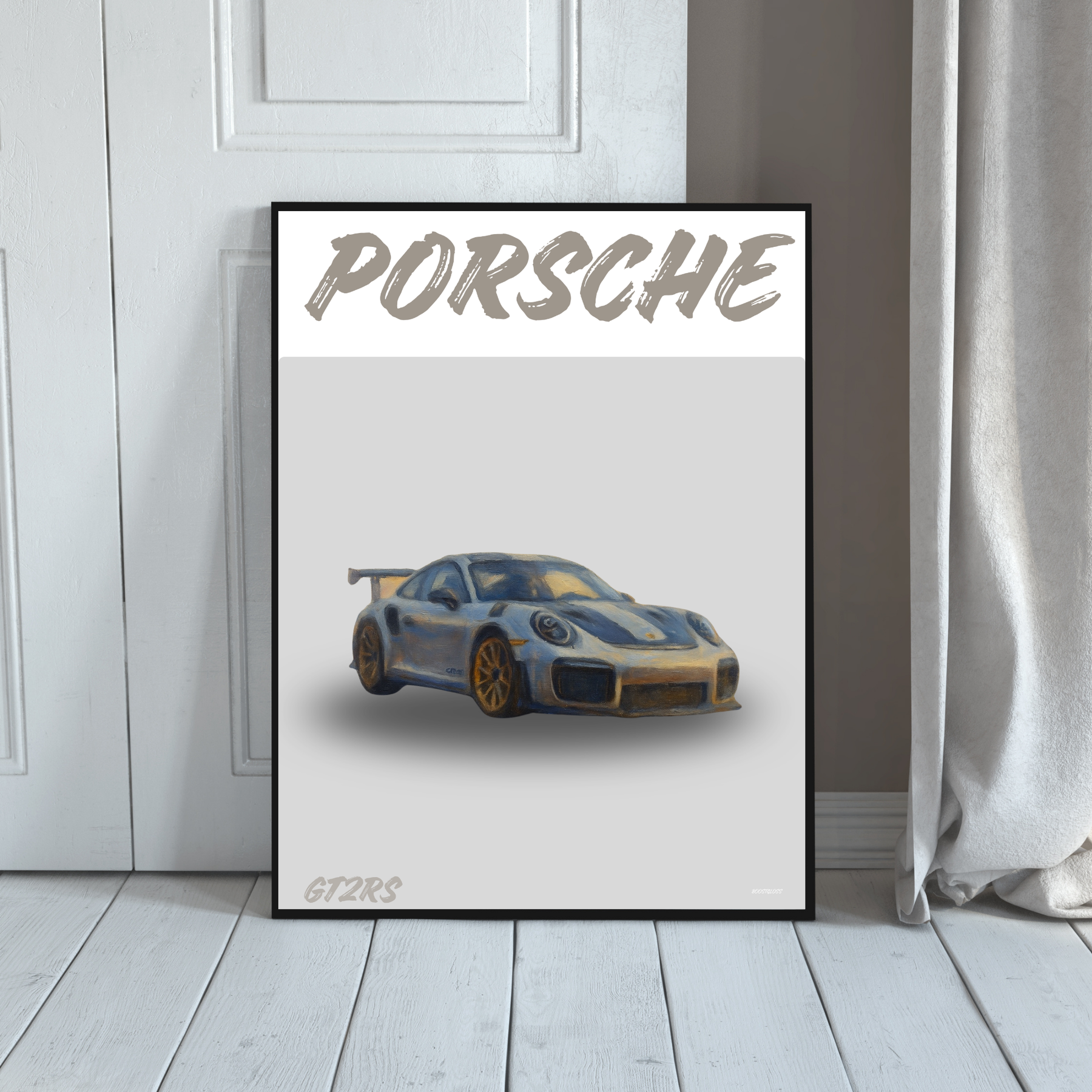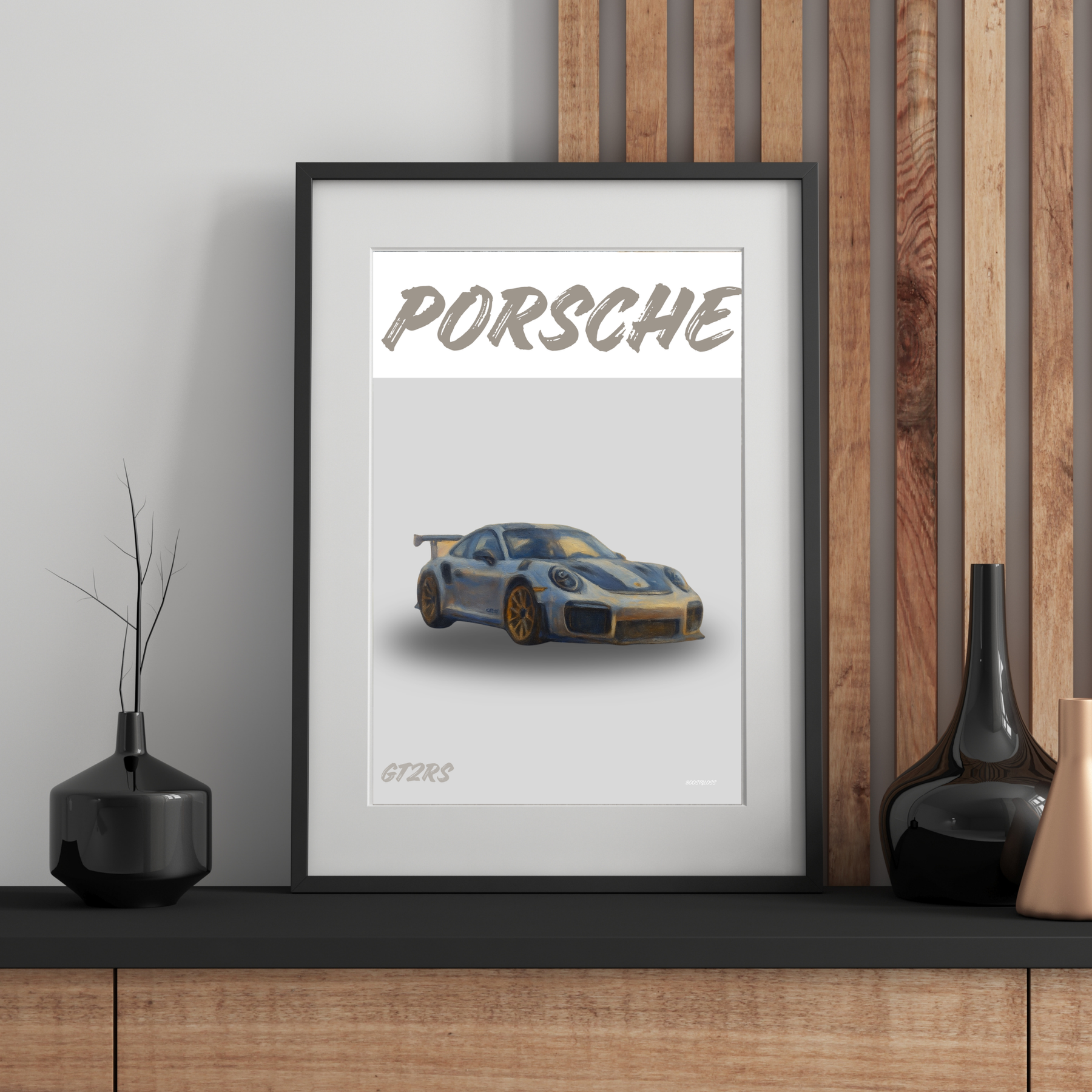 Motivet visar en Porsche GT2 RS avbildad i en elegant stil med färginslag, målad med en konstnärlig precision som fångar bilens råa karaktär och ikoniska siluett. Tryckt i Sverige på matt premiumpapper som framhäver motivets färgtoner och ger en mjuk, elegant yta.