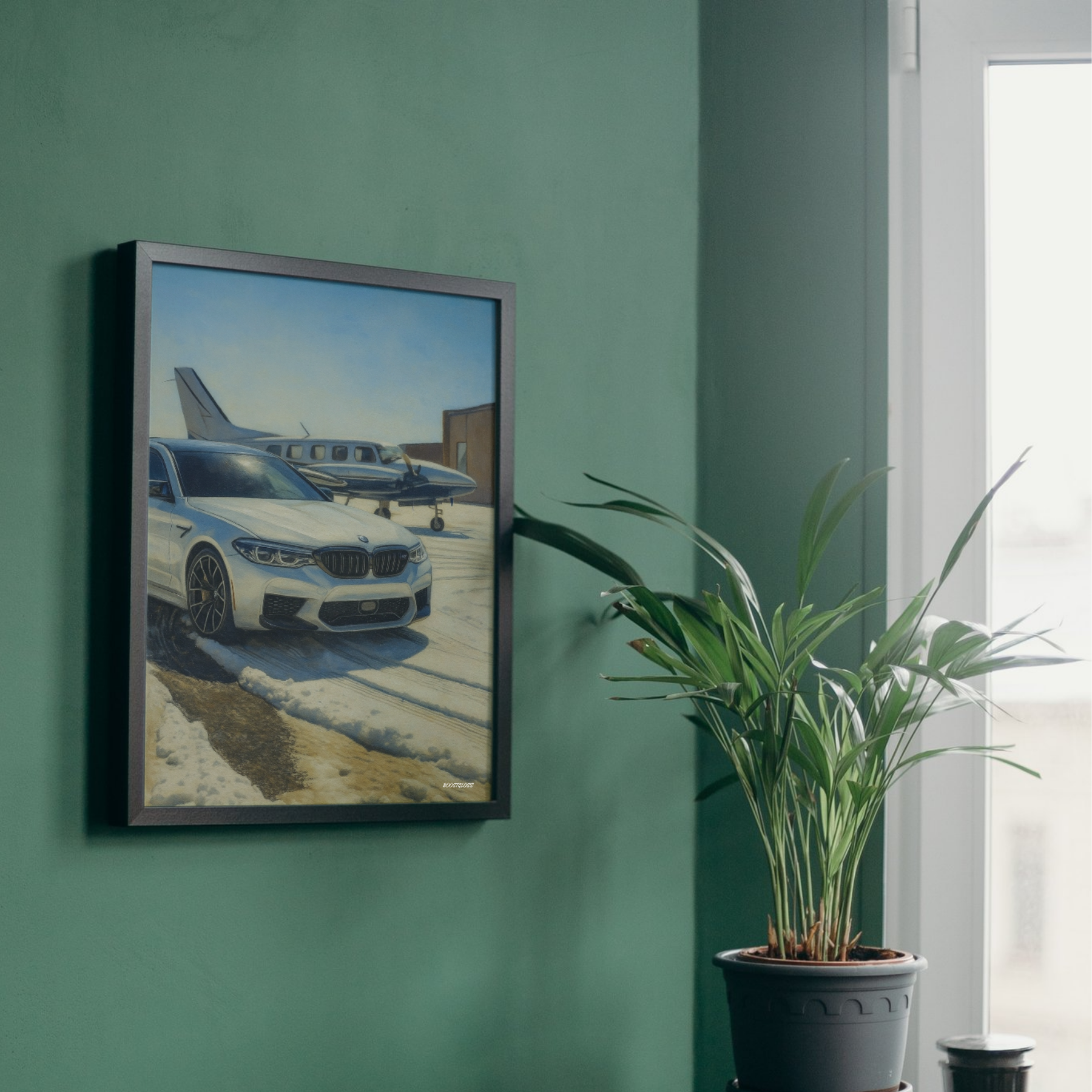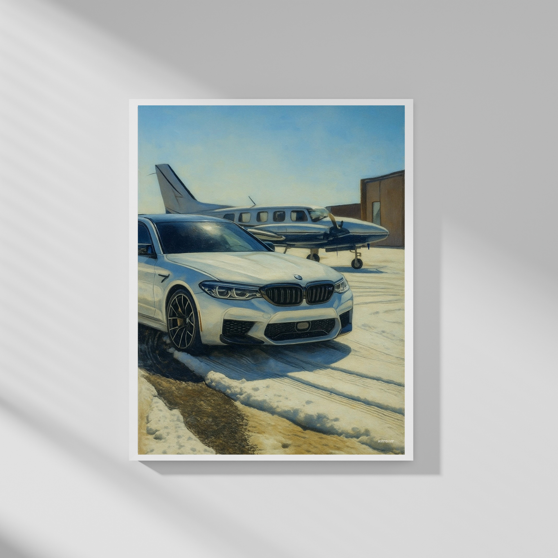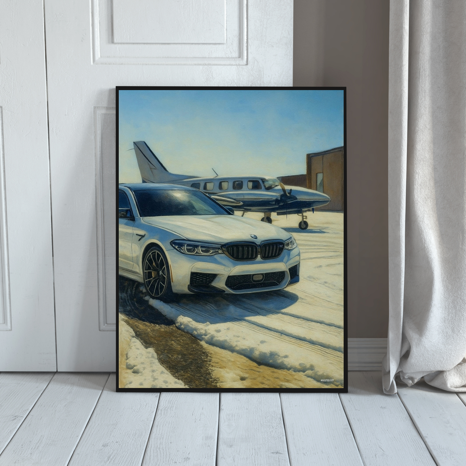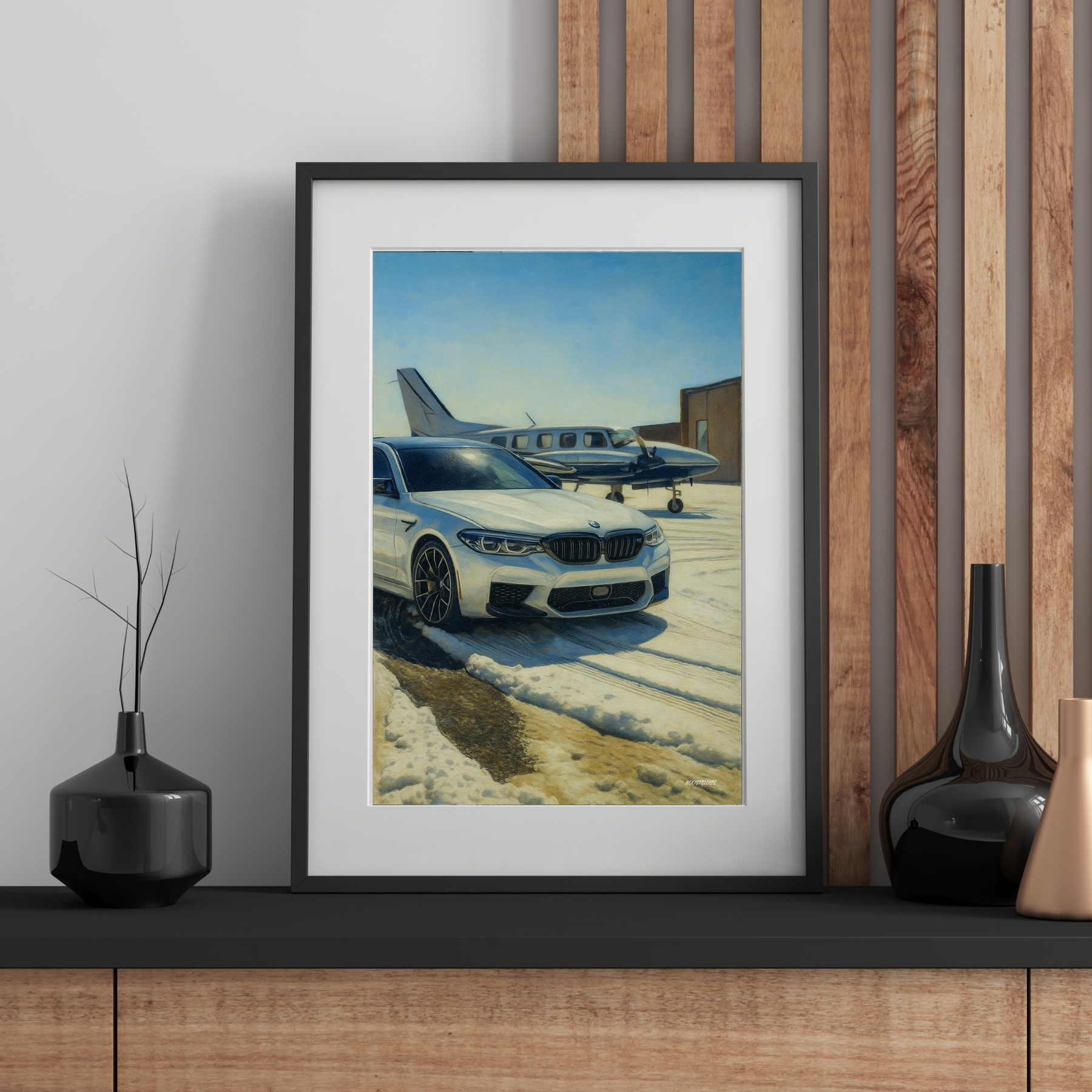 Motivet visar den eleganta M5:an parkerad framför ett privatflygplan på ett solbelyst flygfält – en symbol för rörelse och ambition. Tryckt i Sverige på matt premiumpapper som framhäver målningens mjuka färgövergångar och ger motivet en elegant, konstnärlig finish.
