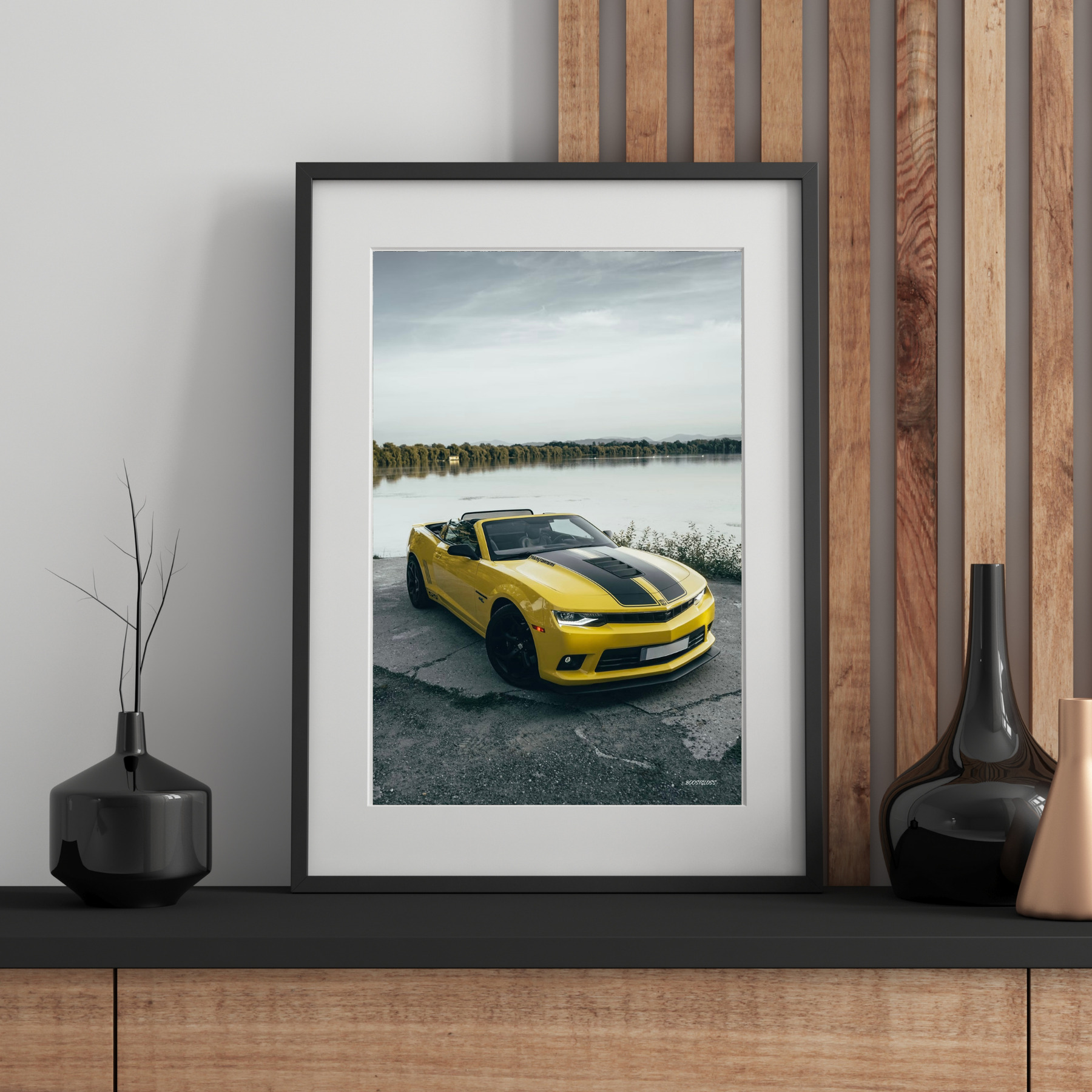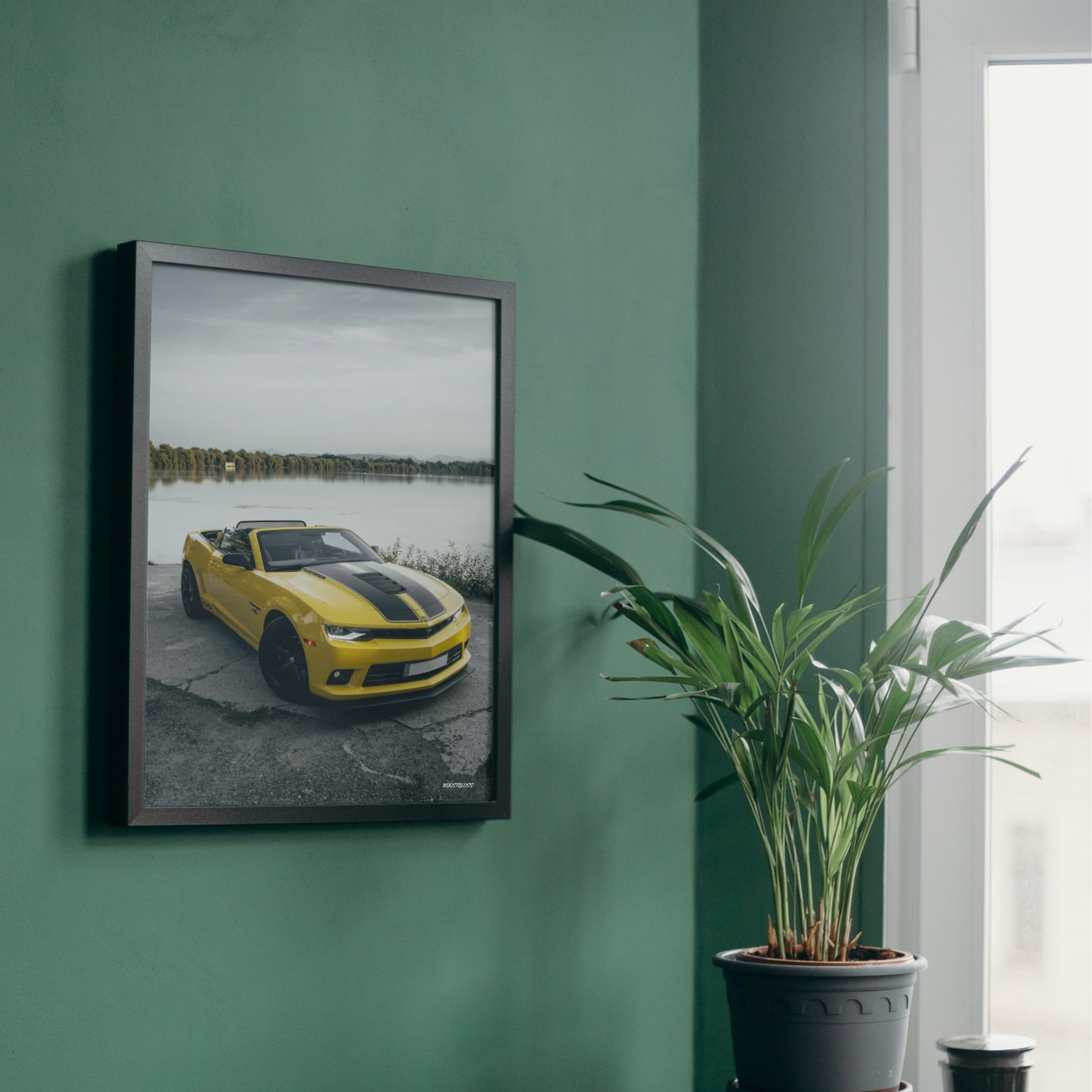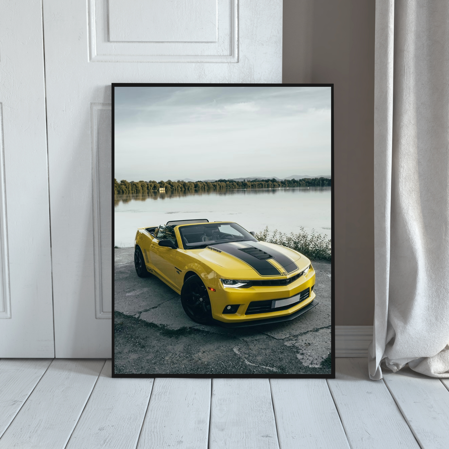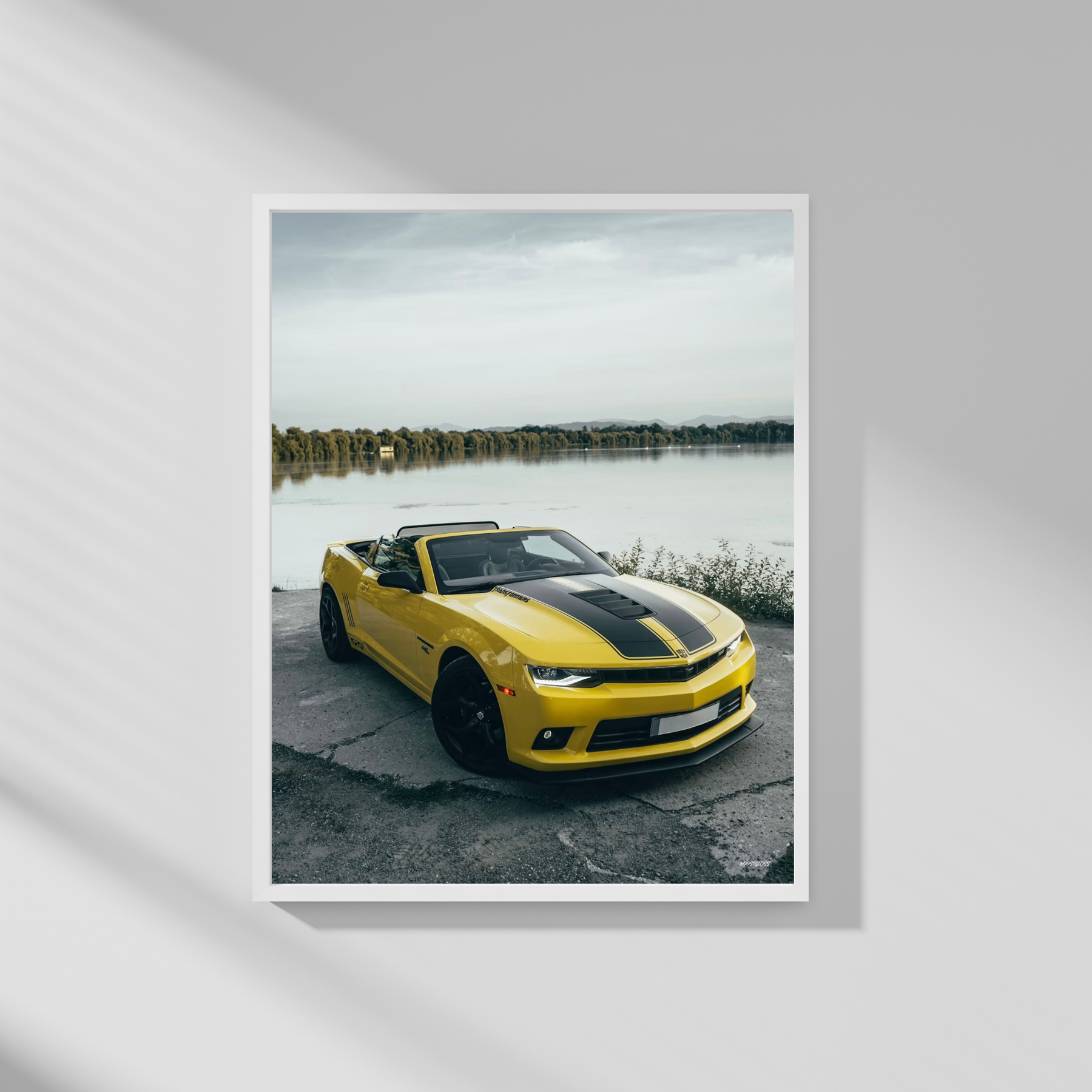 Ge ditt hem en kraftfull och energifylld känsla med denna bild som fångar en gul Chevrolet Camaro cabriolet parkerad vid en stilla sjö.