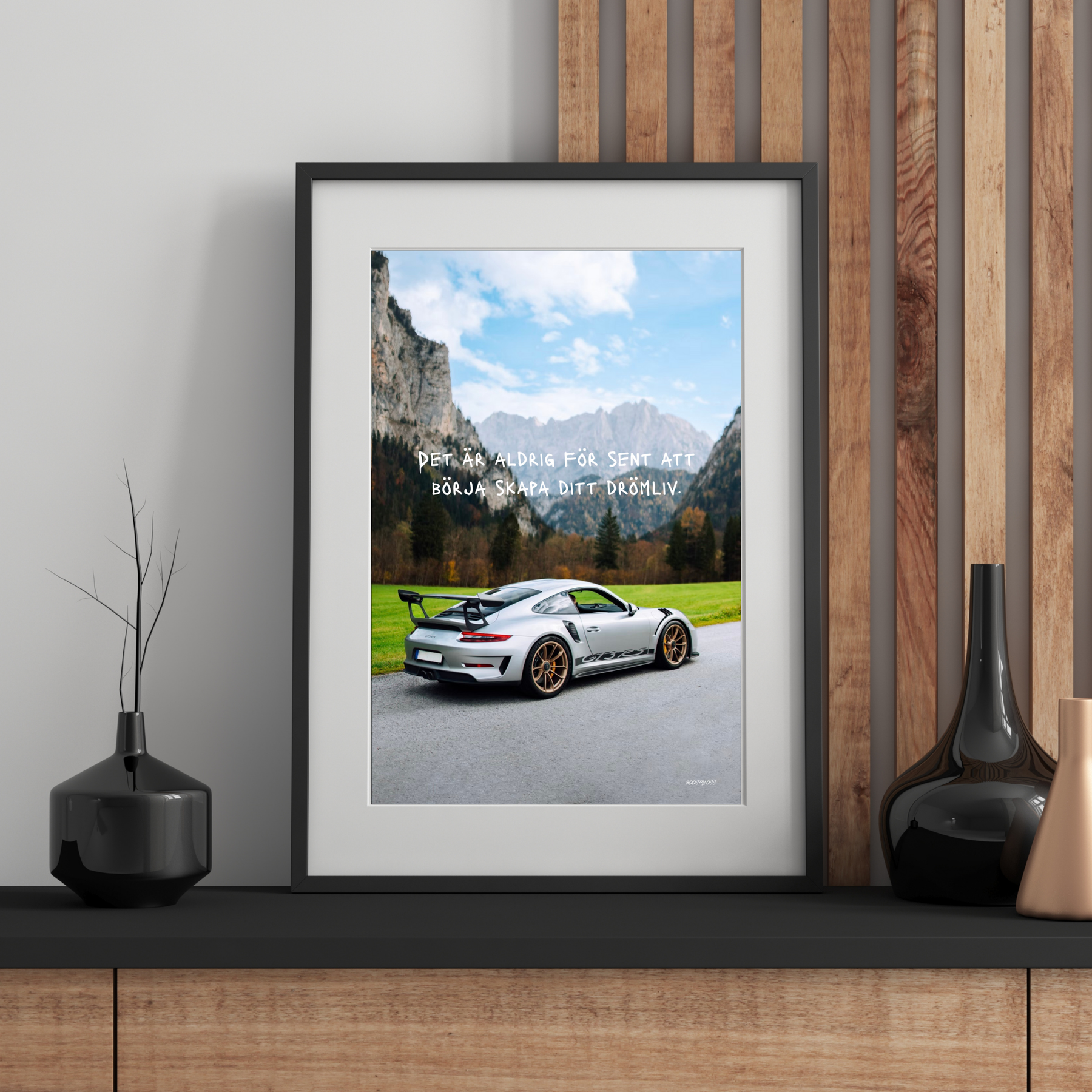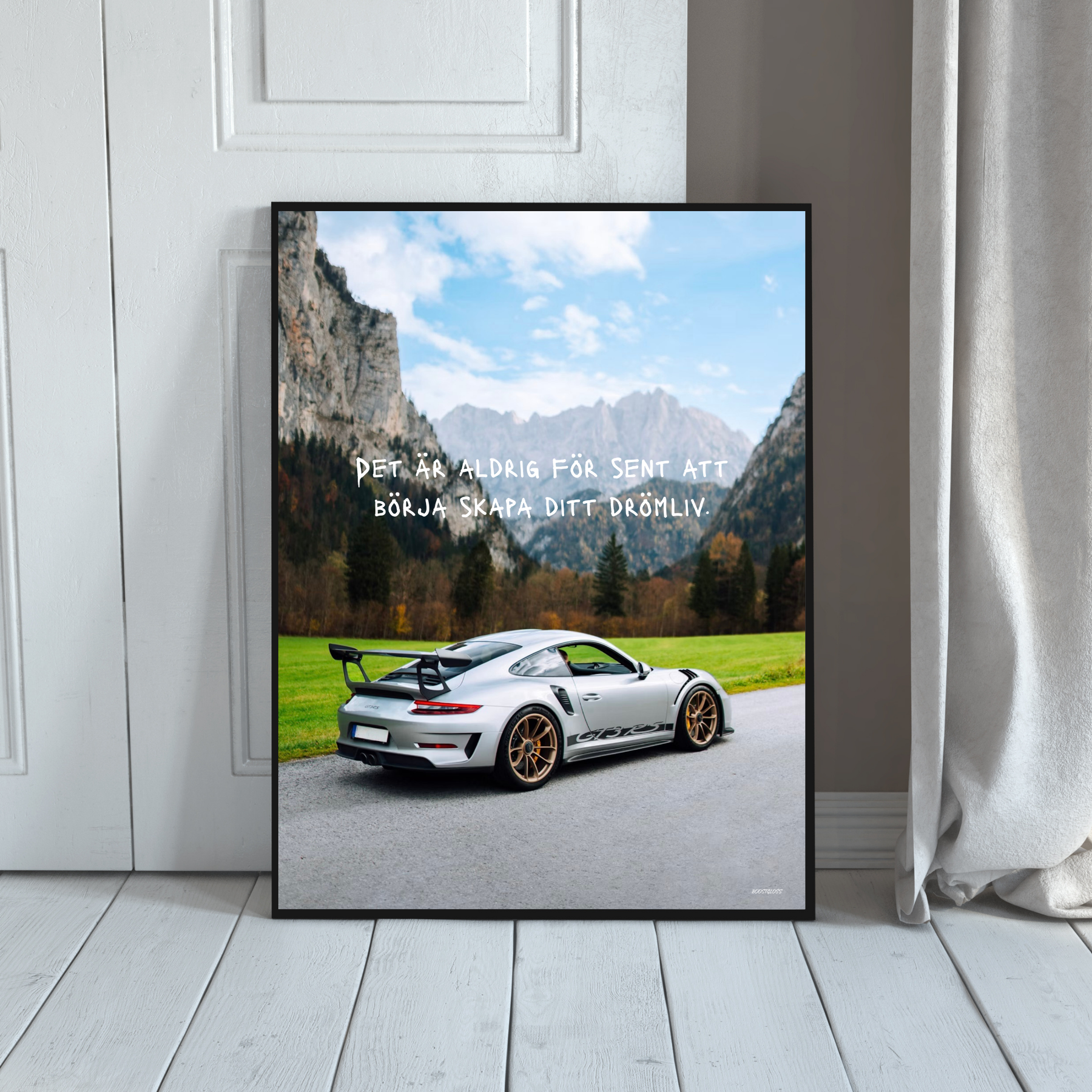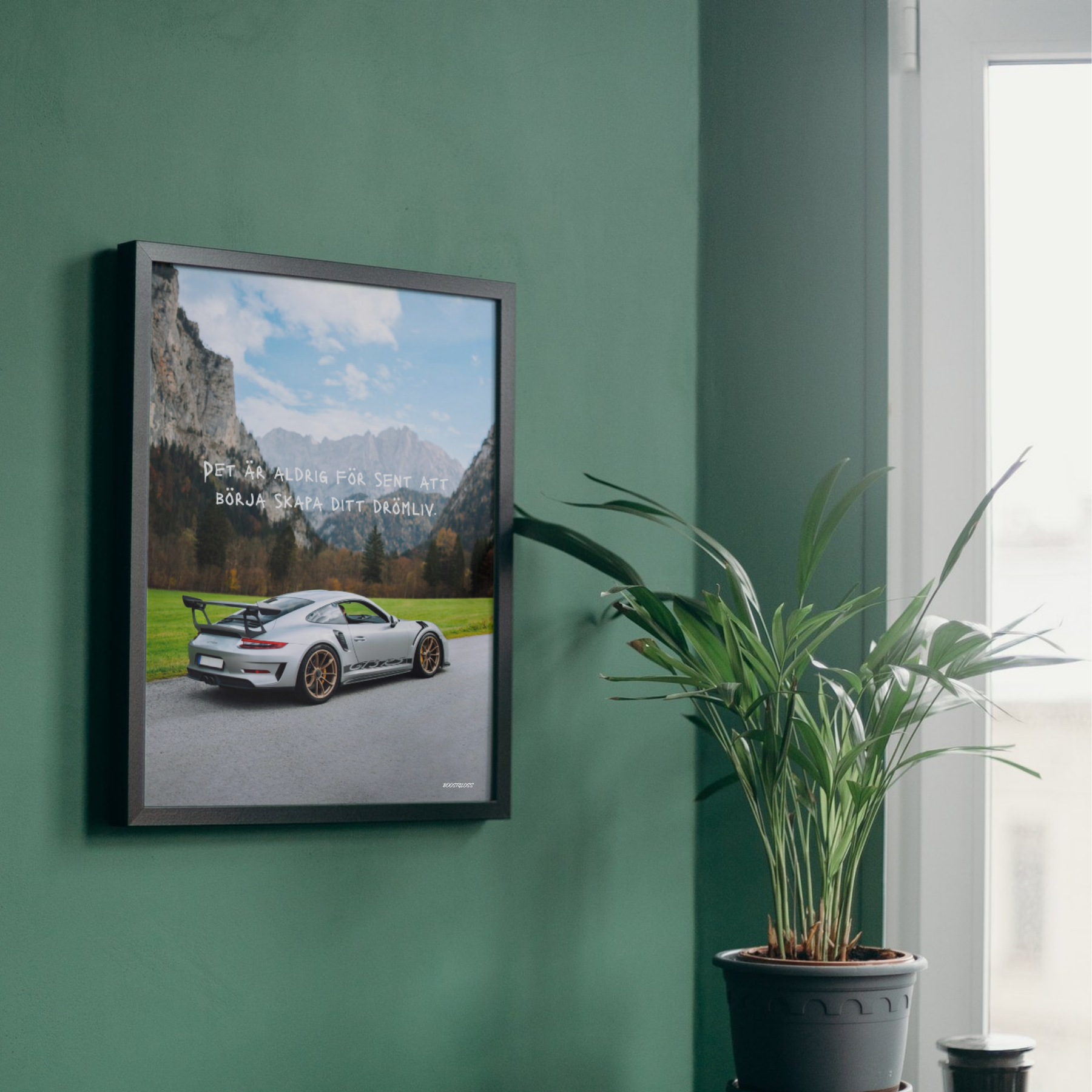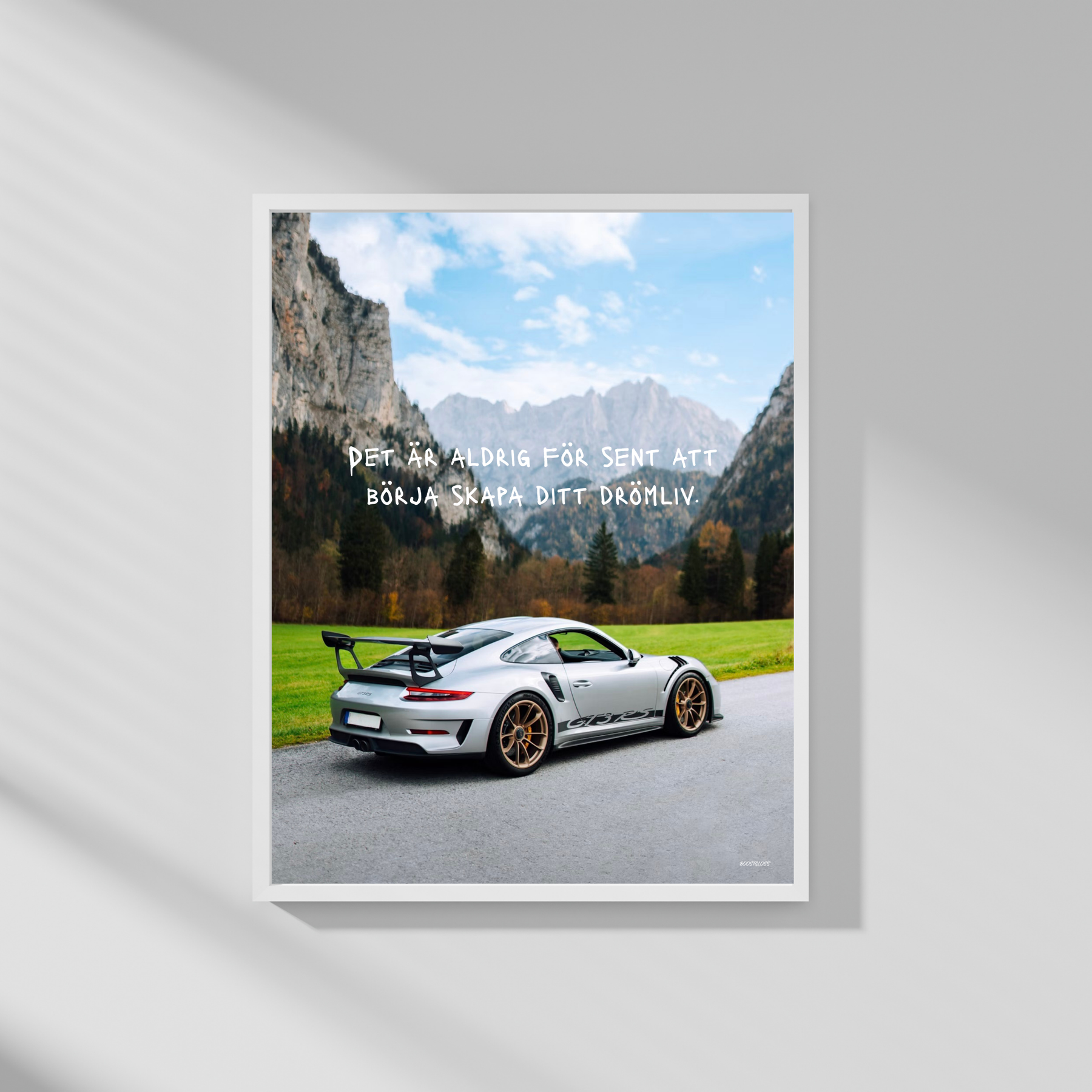 Motivet visar en elegant Porsche omgiven av höga berg och storslagna landskap tillsammans med citatet “Det är aldrig för sent att börja skapa ditt drömliv.” – en inspirerande påminnelse om att nya möjligheter alltid väntar, oavsett var i livet du befinner dig. Postern är tryckt i Sverige på högkvalitativt Glossy premiumpapper, vilket ger en lyxig känsla och lång hållbarhet.