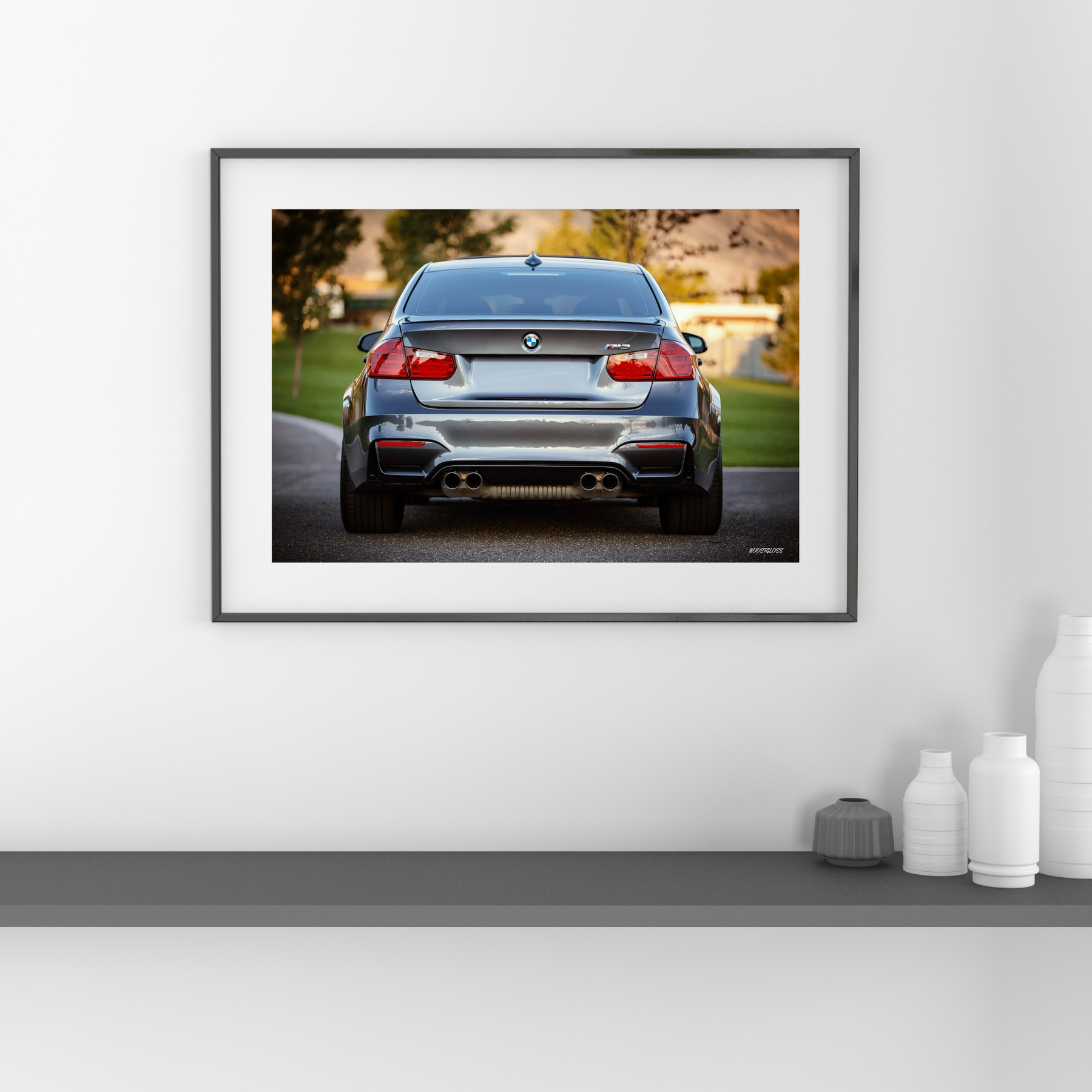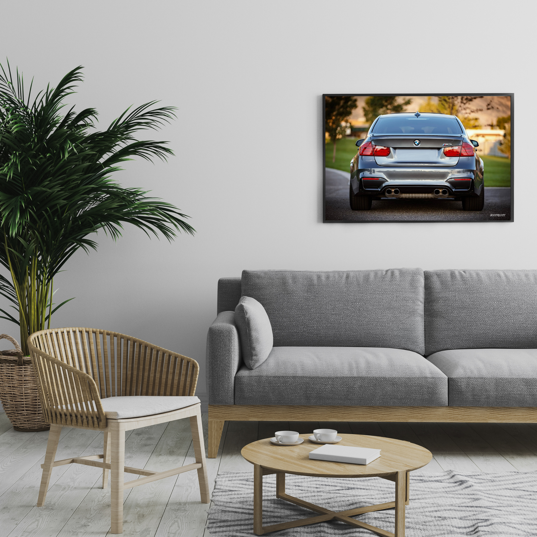 Ge rummet en sportig och exklusiv känsla med denna poster som visar en BMW M3 i metallicgrå lack, fångad bakifrån i ett liggande motiv.