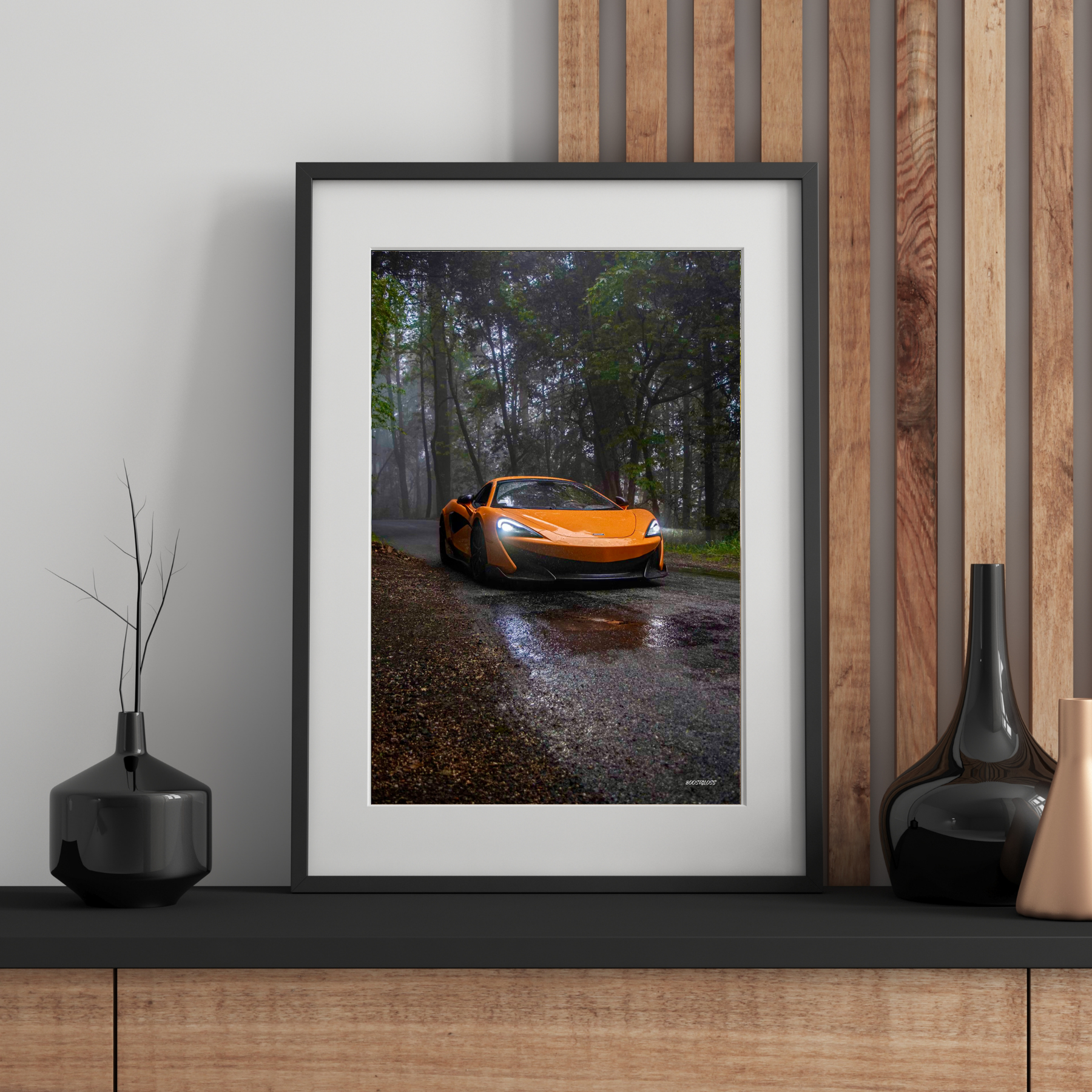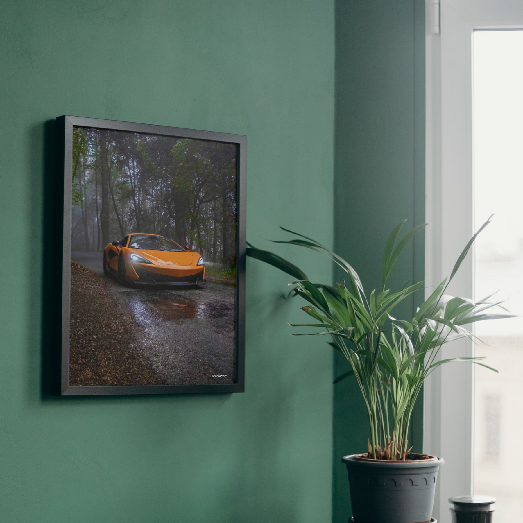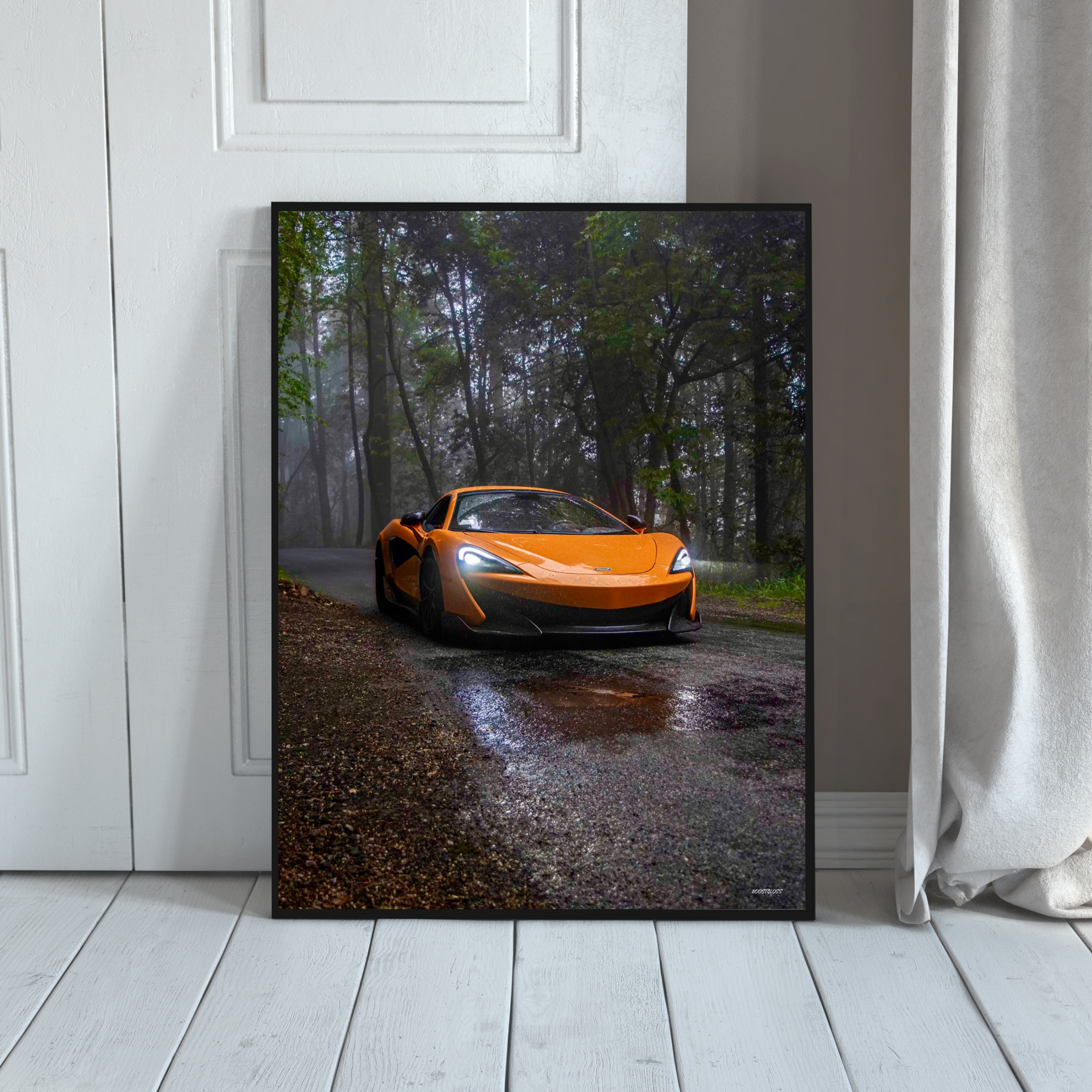 Motivet visar en orange McLaren parkerad mitt på en smal väg i en tät, regnvåt skog, med dropparna fortfarande glittrande på bladen och asfalten som speglar bilens glänsande yta.Postern är tryckt i Sverige på högkvalitativt Glossy premiumpapper, vilket ger en lyxig finish, djup färgåtergivning och lång hållbarhet.