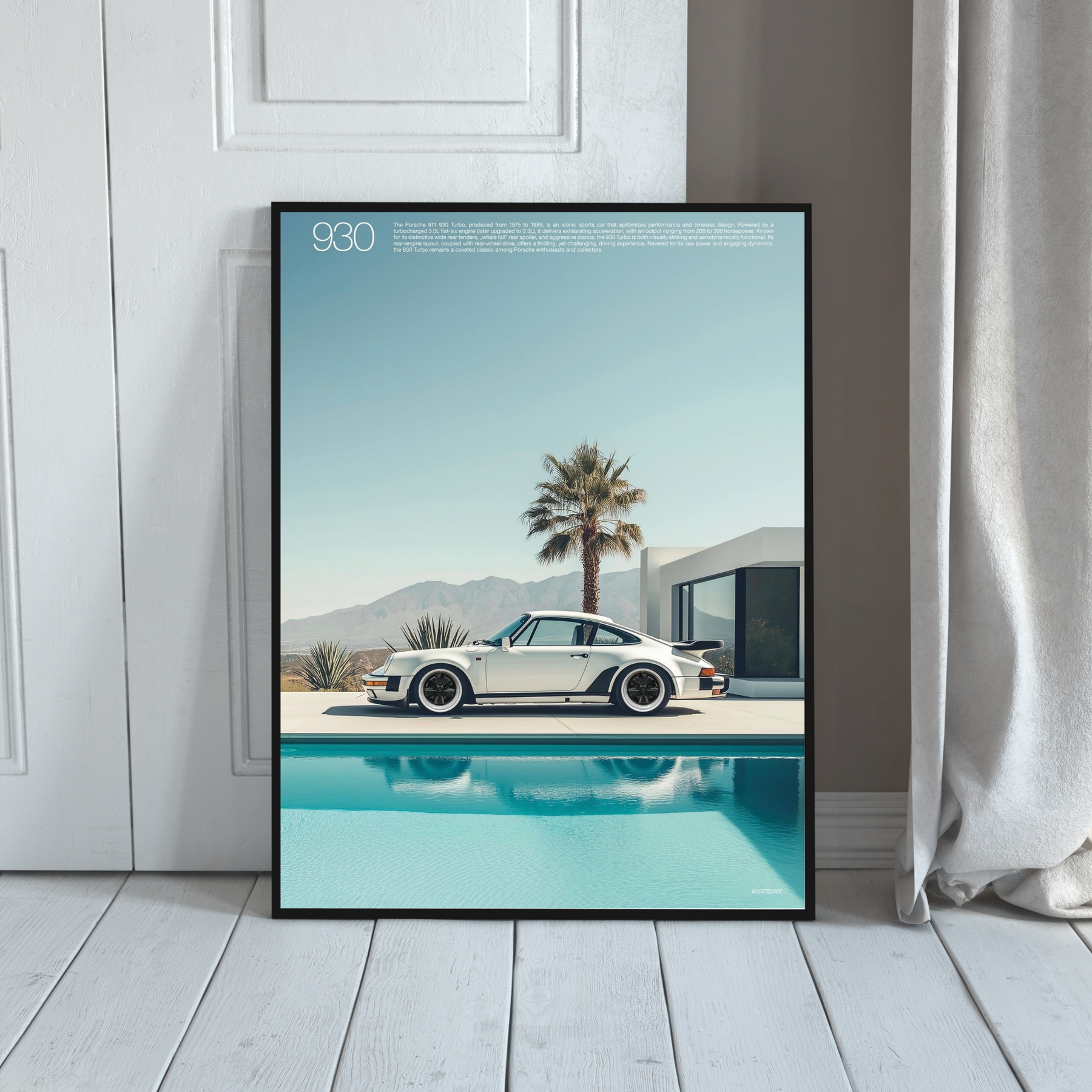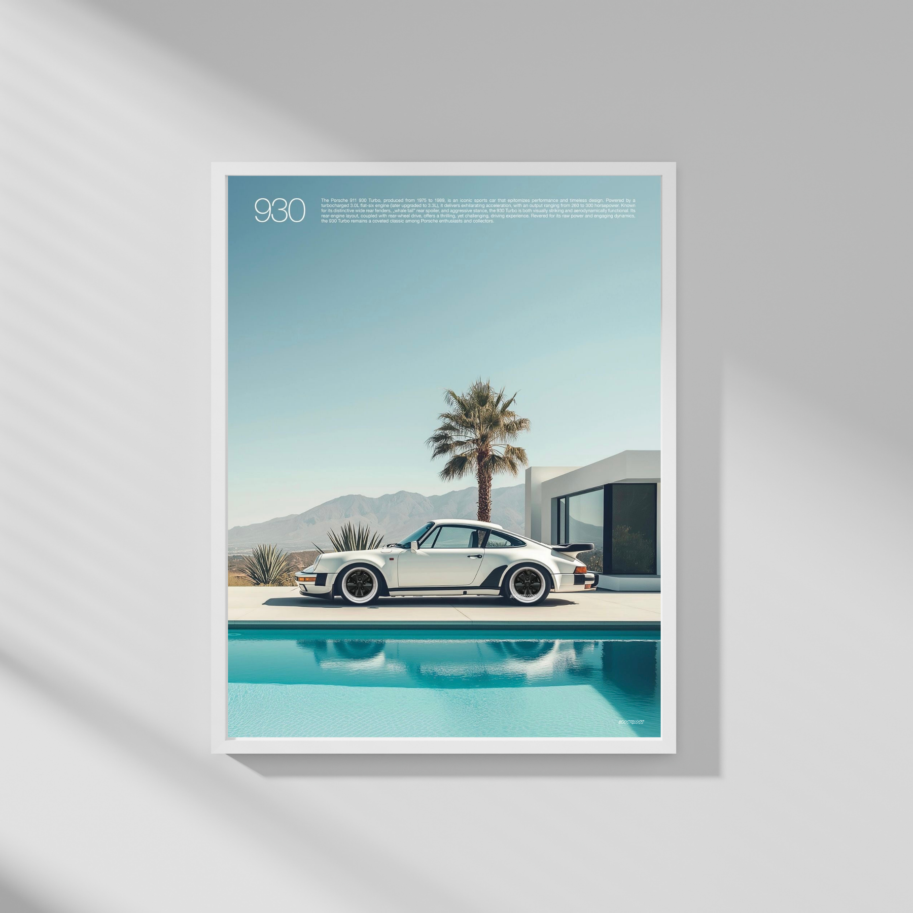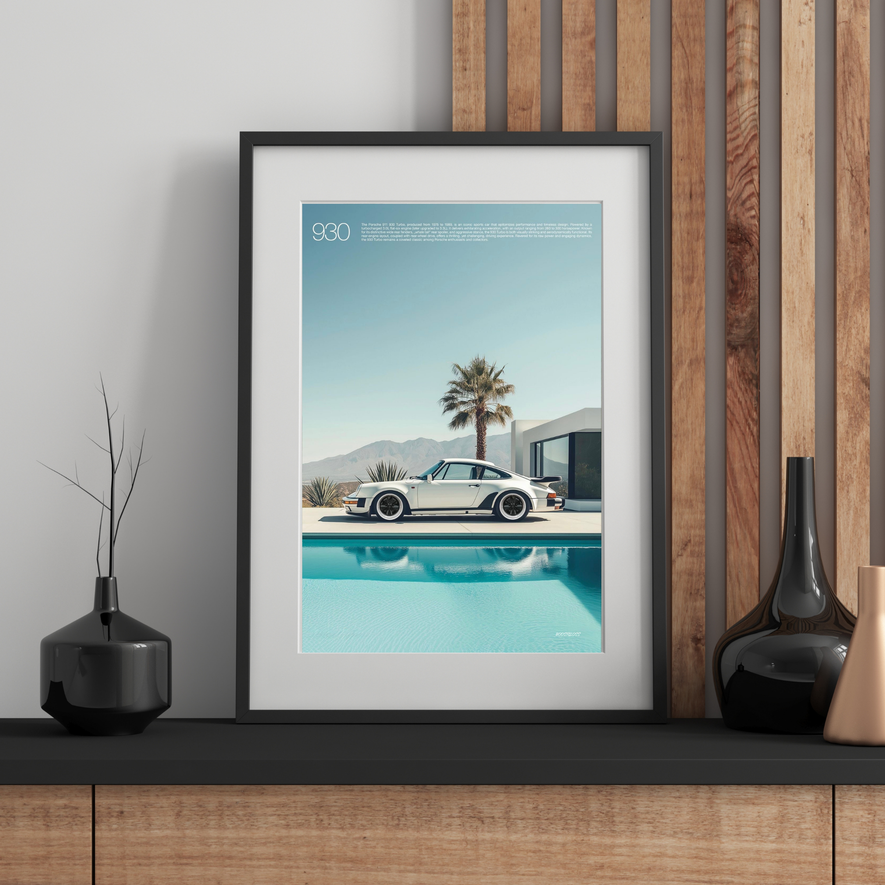 Ge ditt hem en känsla av tidlös lyx och sofistikerad bilkultur med denna konstposter som porträtterar den legendariska Porsche 930 i en harmonisk, modern miljö – fångad vid en stilren poolterrass med palmer, öppna horisonter och arkitektur som framhäver bilens distinkta siluett och klassiska formspråk.