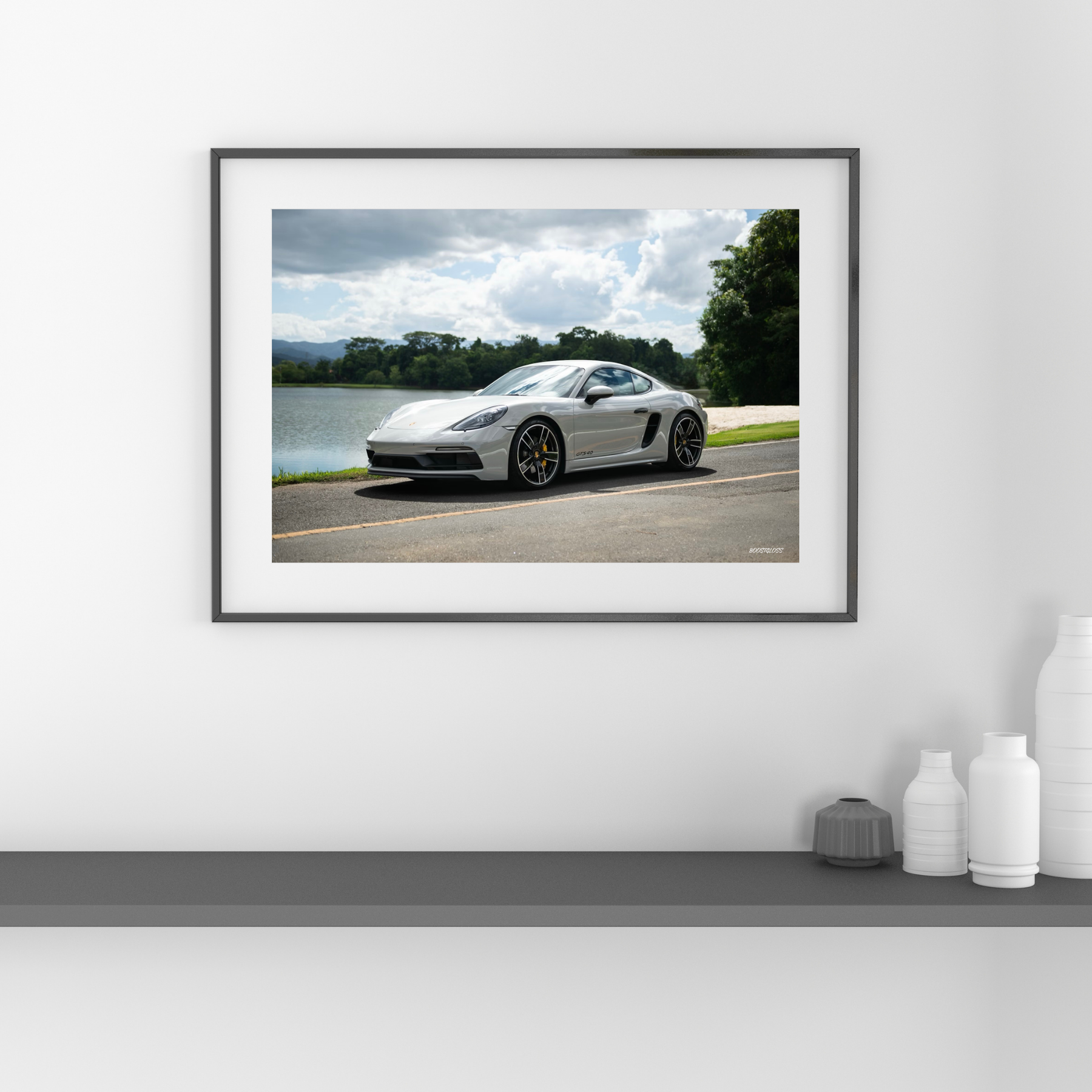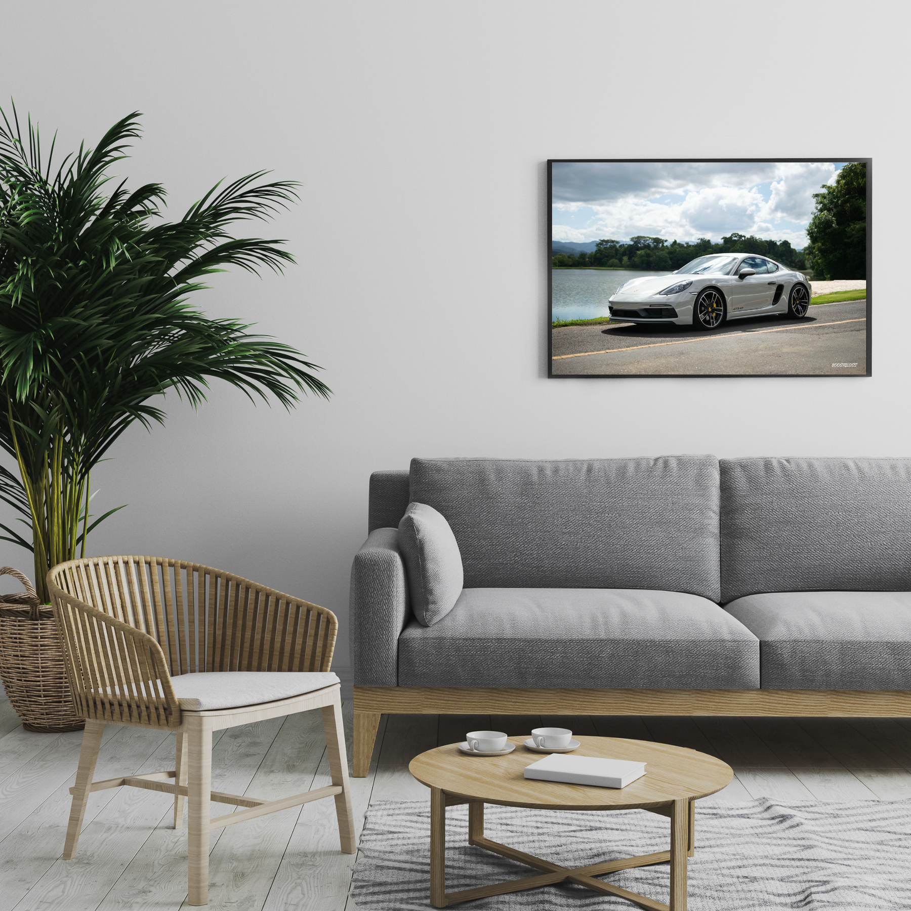 Ge ditt hem en elegant och sportig känsla med denna exklusiva poster som fångar en silverfärgad Porsche 718 Cayman GTS 4.0, fotograferad vid en stilla sjö med grön natur i bakgrunden.