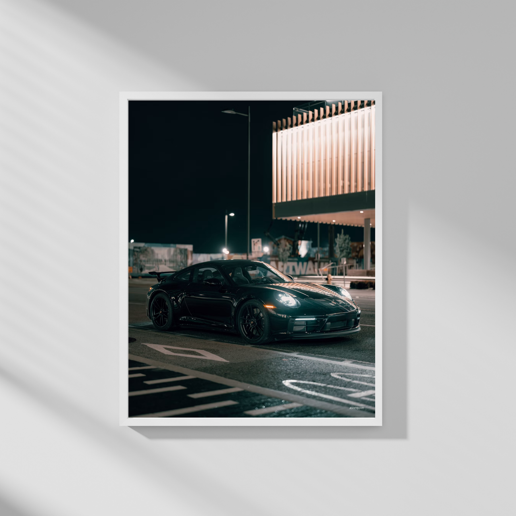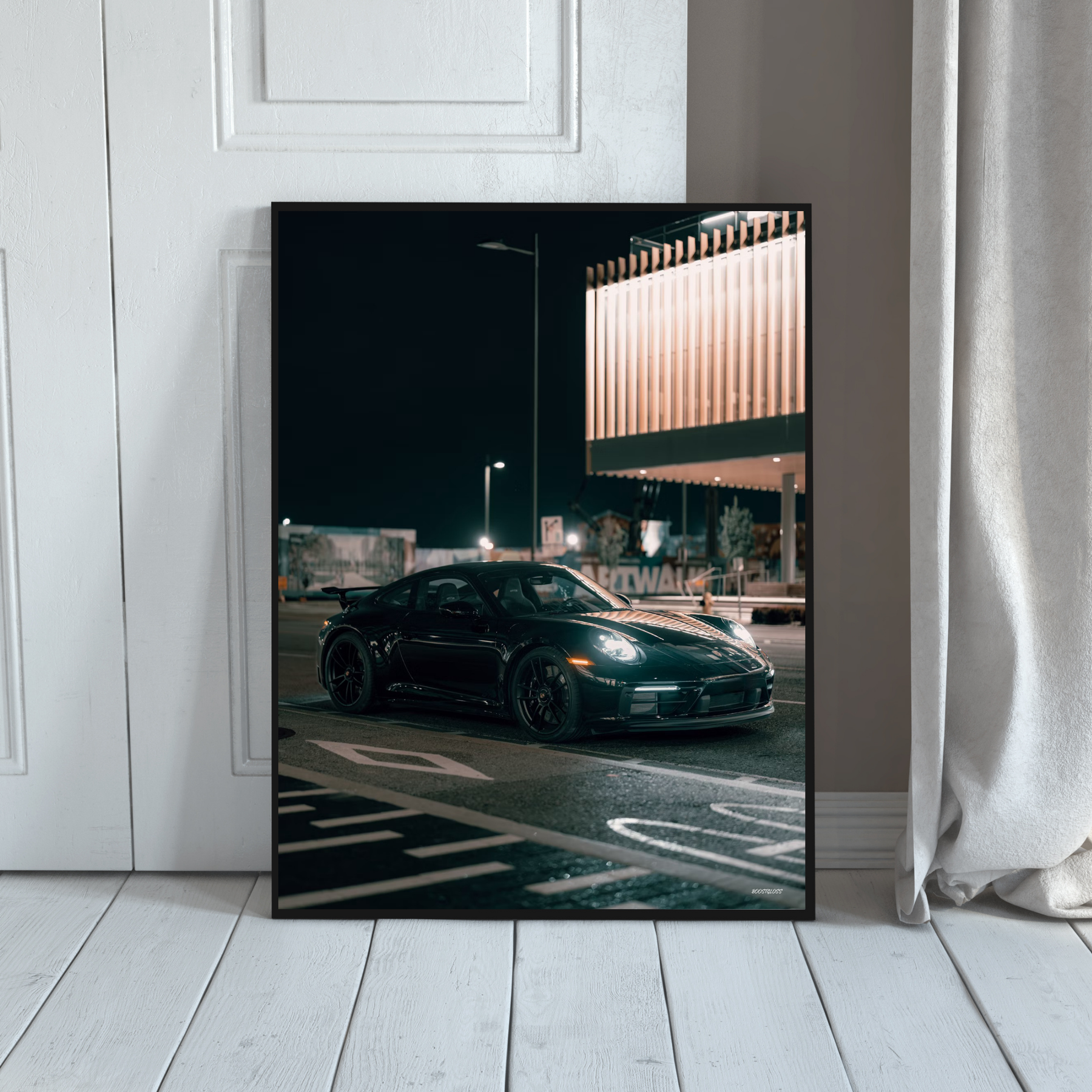 Motivet visar en svart Porsche som står parkerad under stadens ljus, där byggnadernas reflektioner dansar längs karossens linjer. Bilden fångar ögonblicket mellan stillhet och rörelse – en symbol för kontroll, fokus och ambition. Postern är tryckt i Sverige på högkvalitativt Glossy premiumpapper, vilket ger en lyxig finish, djup kontrast och lång hållbarhet.