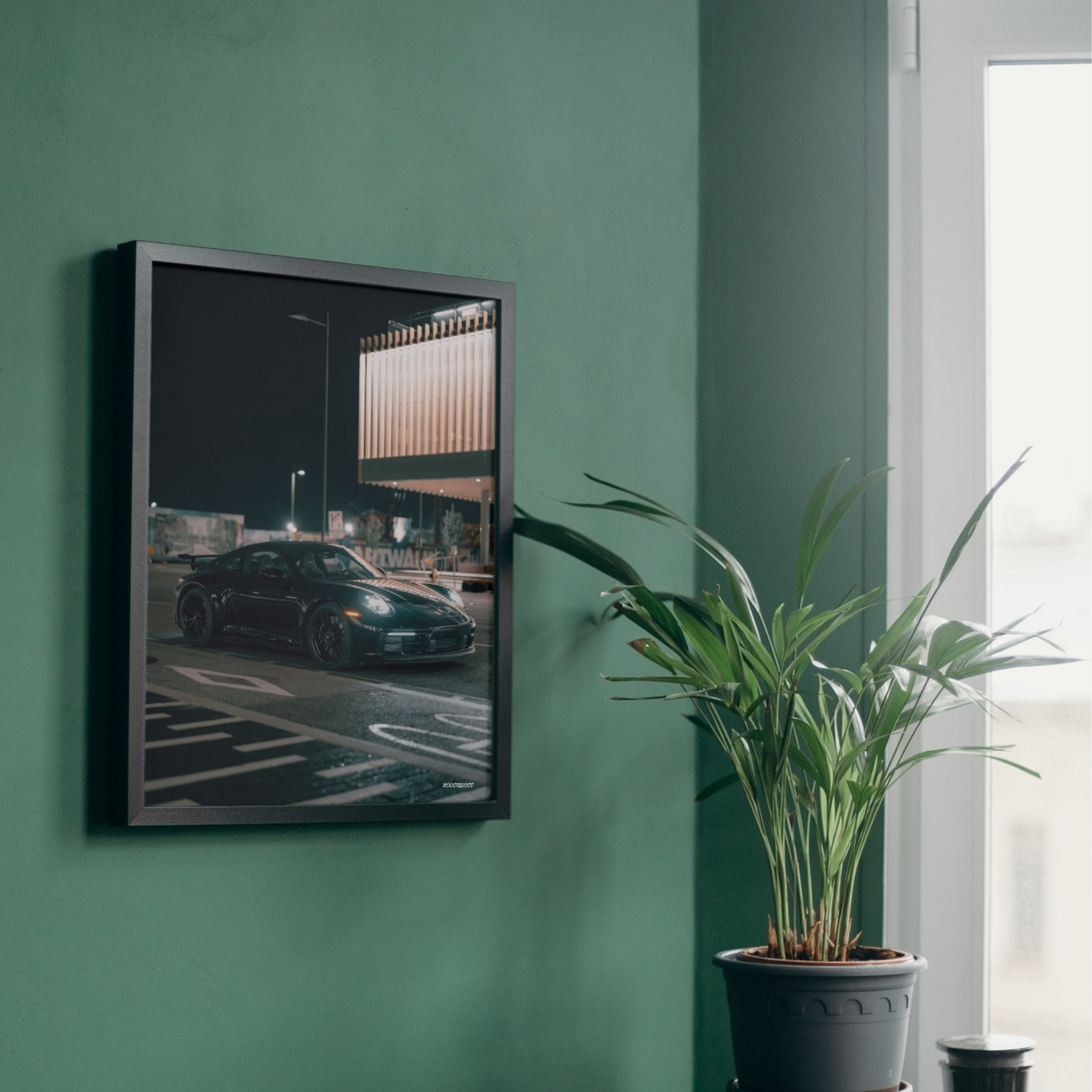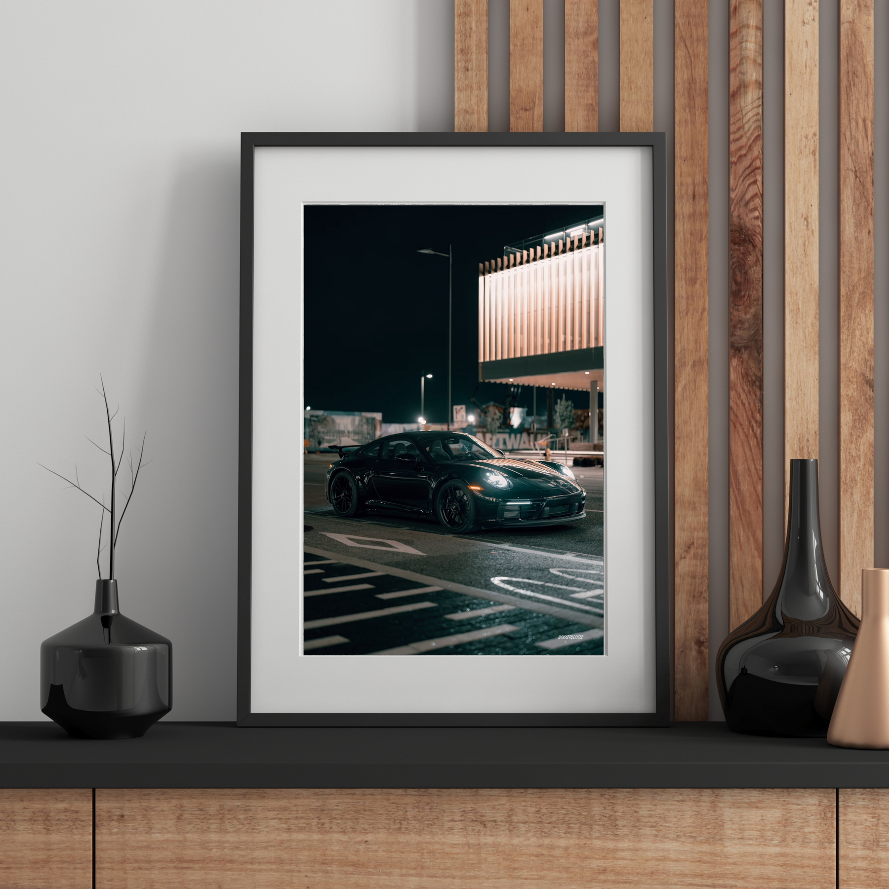 Ge din vägg ett distinkt statement – beställ din poster idag och låt den svarta Porschen bli en symbol för målmedvetenhet, passion och styrka.