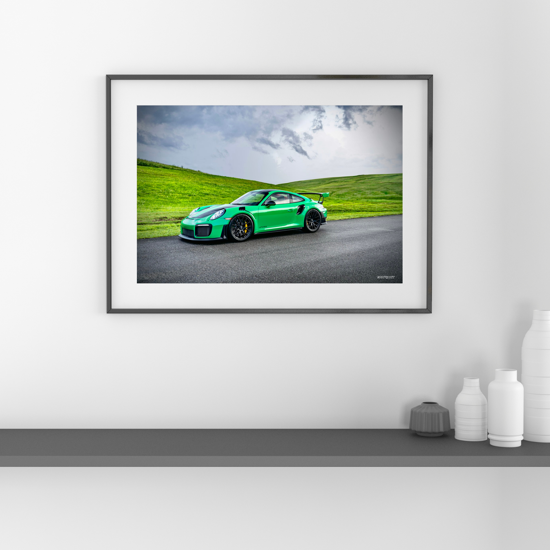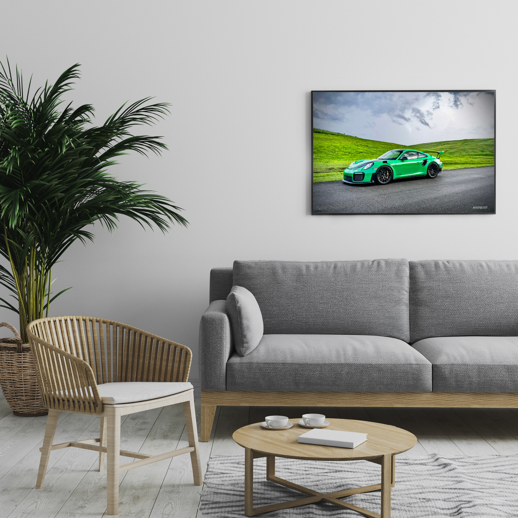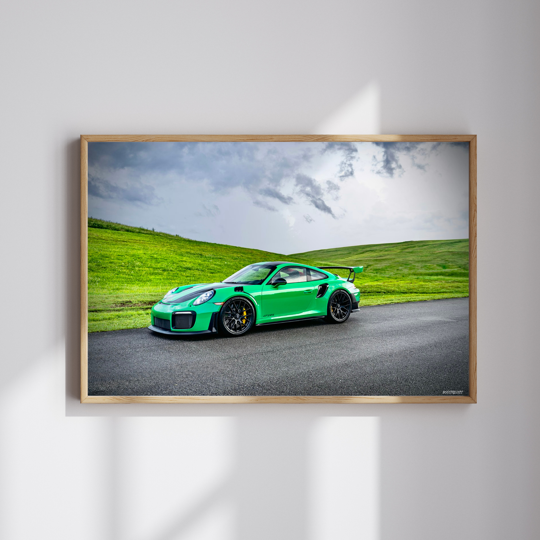 Ge ditt hem en kraftfull dos av superbilskaraktär med denna poster som fångar en Porsche GT2 RS i sitt absolut mest ikoniska element.
