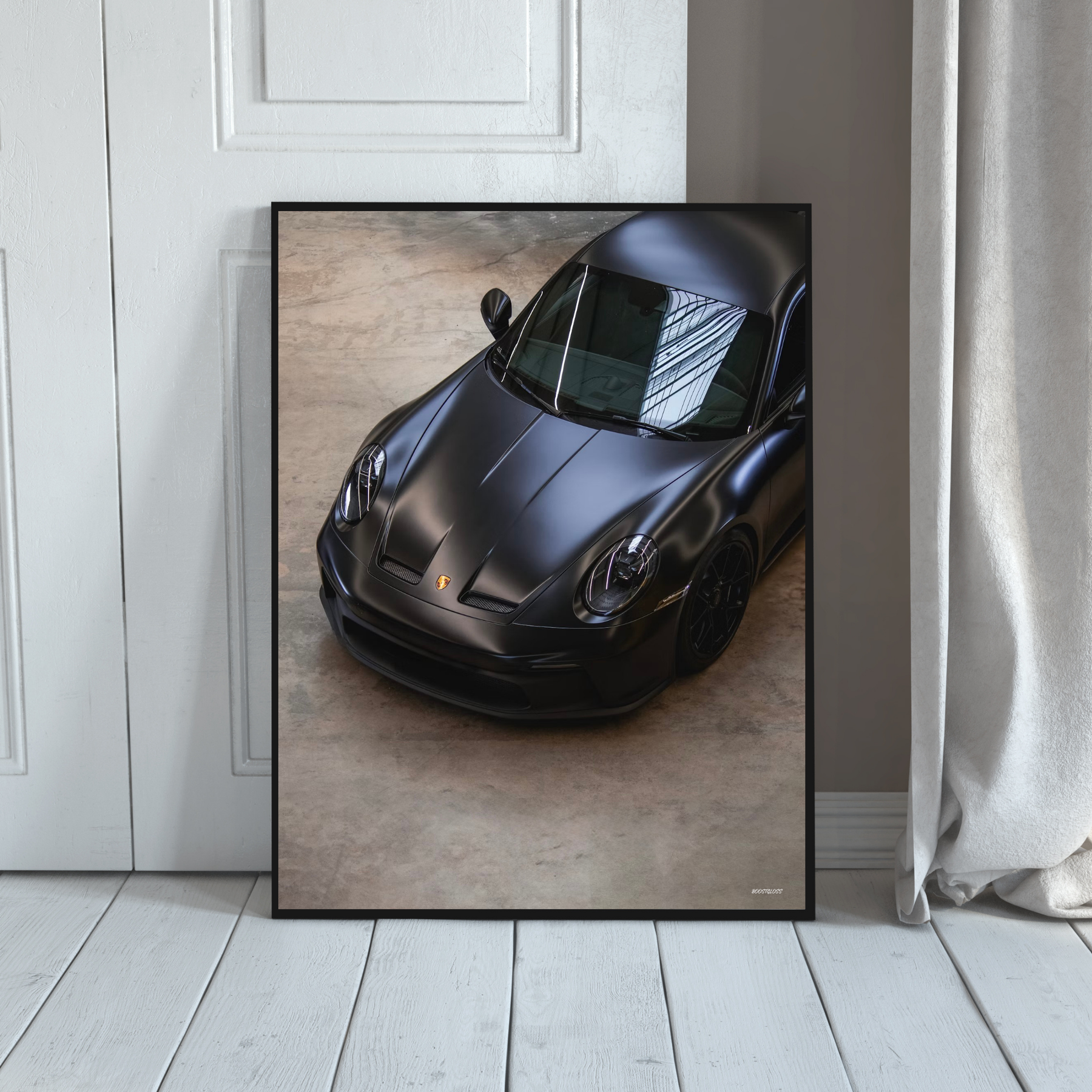 Ge ditt hem en exklusiv och kraftfull känsla med denna poster som fångar en mattsvart Porsche, fotograferad snett ovanifrån framifrån – ett perspektiv som framhäver bilens aggressiva linjer och eleganta siluett.