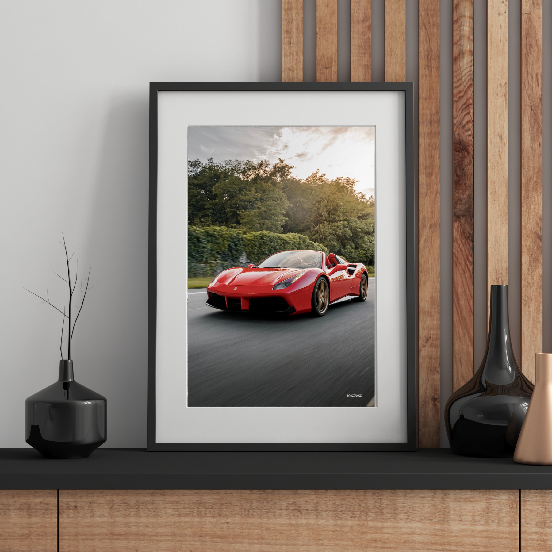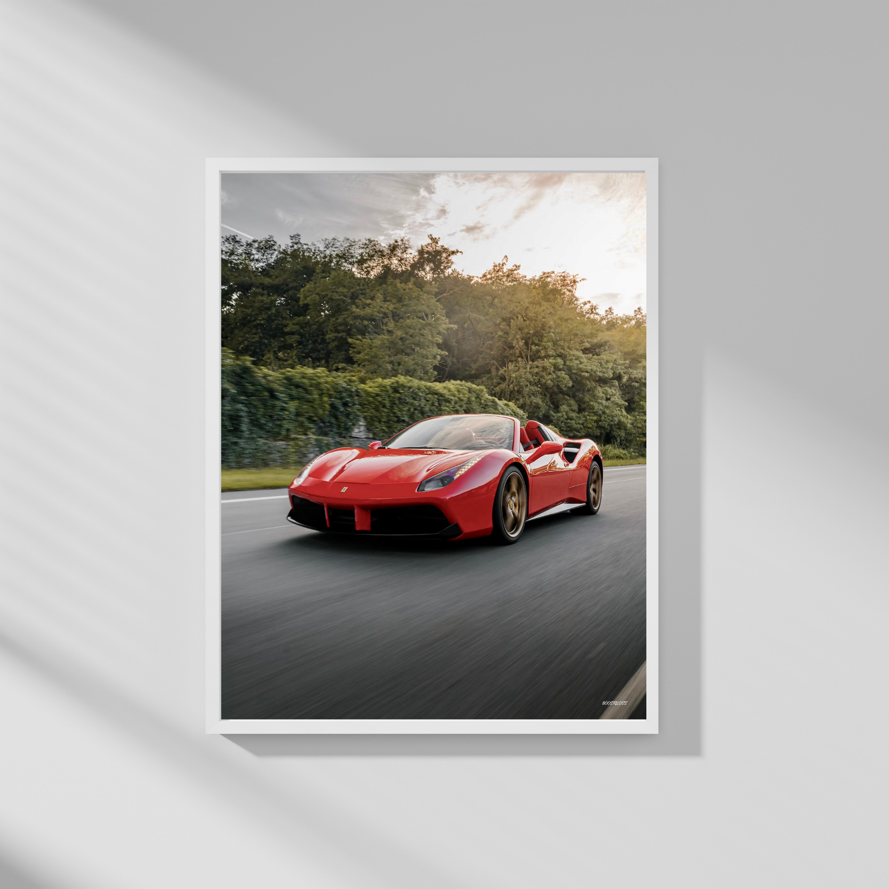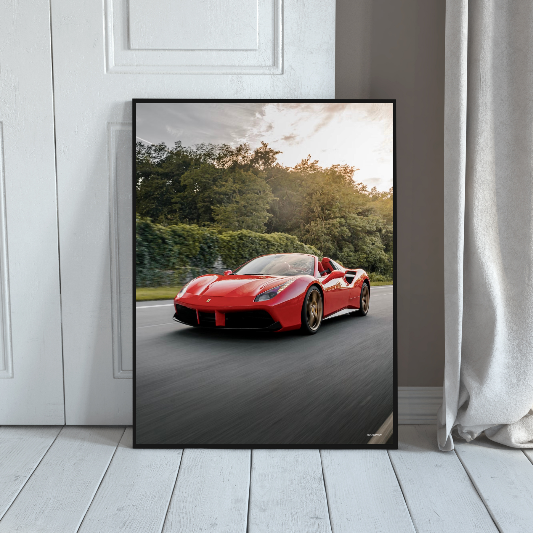 Fånga känslan av fart, passion och exklusivitet med denna poster som visar en Ferrari i intensivt röd lack, fångad i rörelse på öppen väg.
