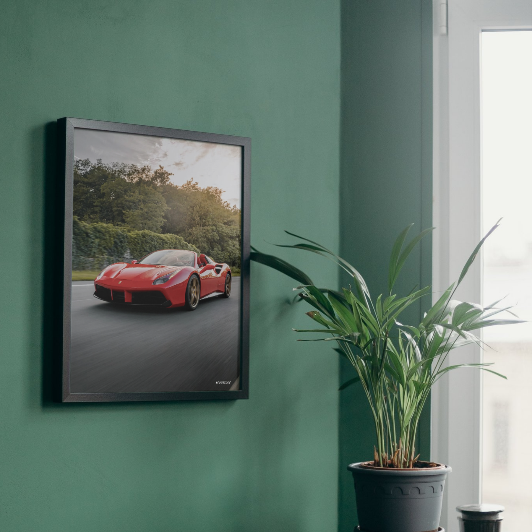 Bilens aerodynamiska linjer, de sportiga fälgarna och den låga, kraftfulla fronten framhävs i detalj och symboliserar allt som gör Ferrari till ett av världens mest ikoniska bilmärken. Postern är tryckt i Sverige på högkvalitativt Glossy premiumpapper, vilket ger en elegant finish, djupa färger och lång hållbarhet.